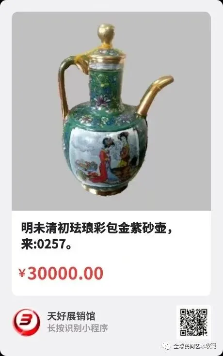 明未清初珐琅彩包金紫砂壶,底款大明年造,祟珍藏,高27厘米,来源:0257。