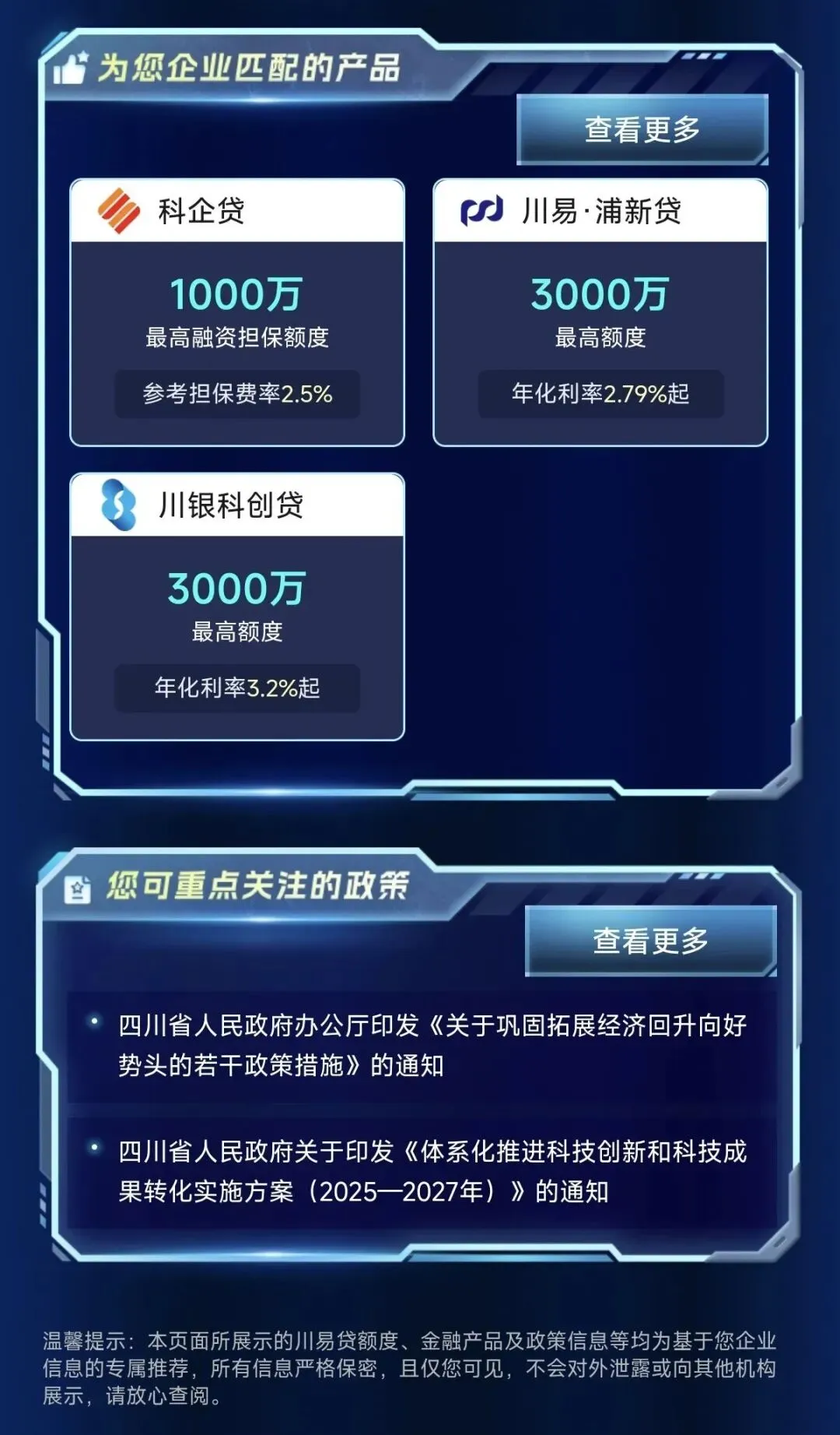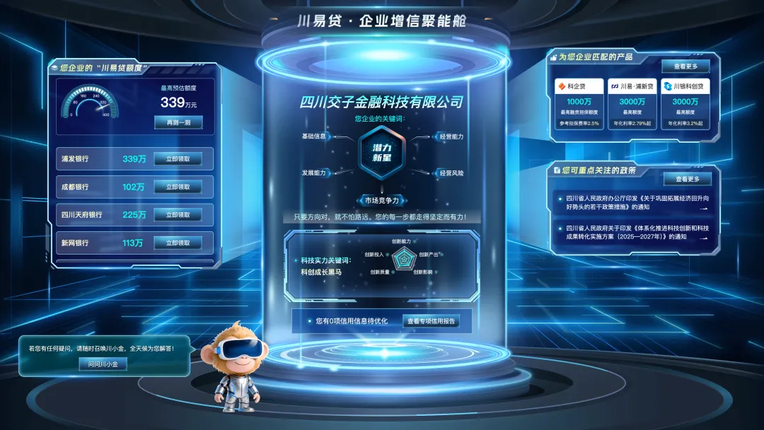 在“聚能舱”,企业可一屏查看平台为其智能匹配的“川易贷额度”、各类综合金融产品以及惠企政策,直观地对比各类产品的额度、利率,高效地获取适配的政策红利。