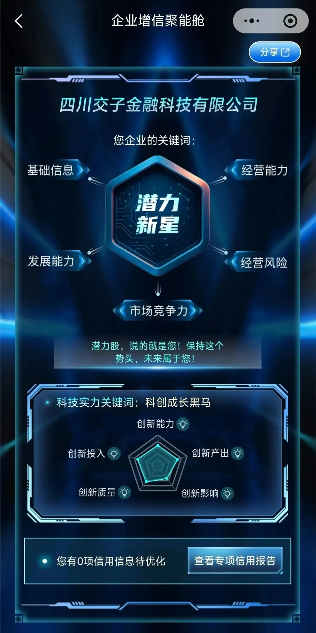 另外,针对科技型企业,还会额外推送“科技实力关键词”与“创新雷达图”,从创新发展、创新产出、创新质量等五大领域直观呈现企业科技优势,将隐性创新实力转化为可视化资产,提升融资成功率。