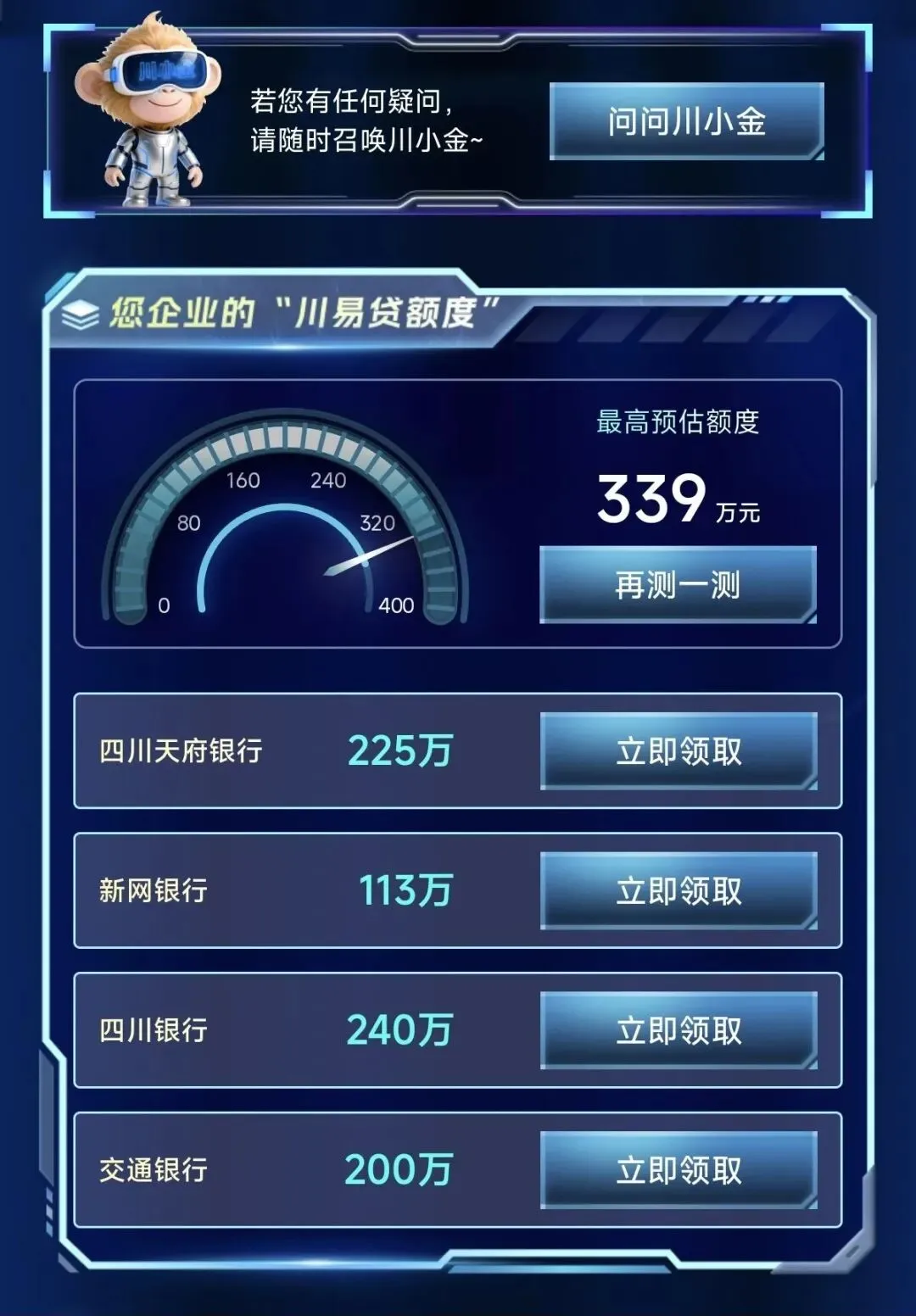 还有专属AI融资顾问“川小金”全天候在线,实时解答融资相关各类疑问。