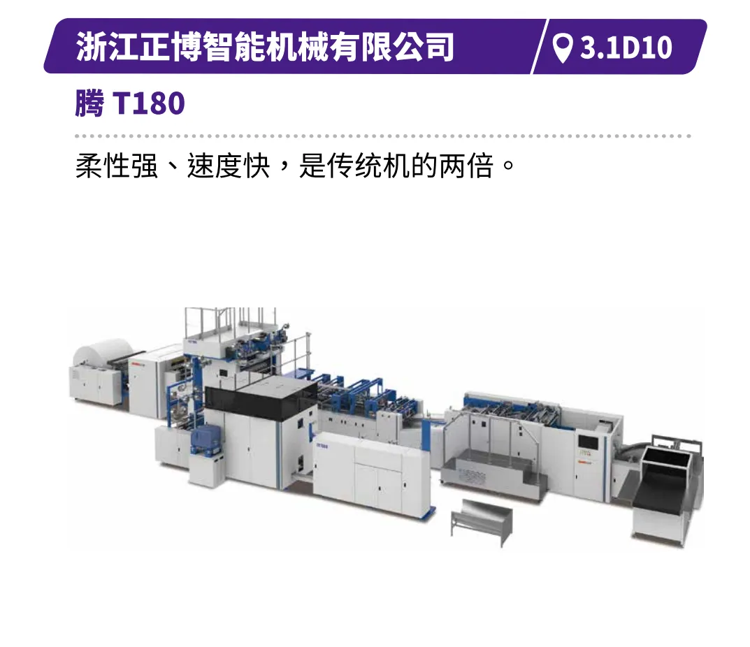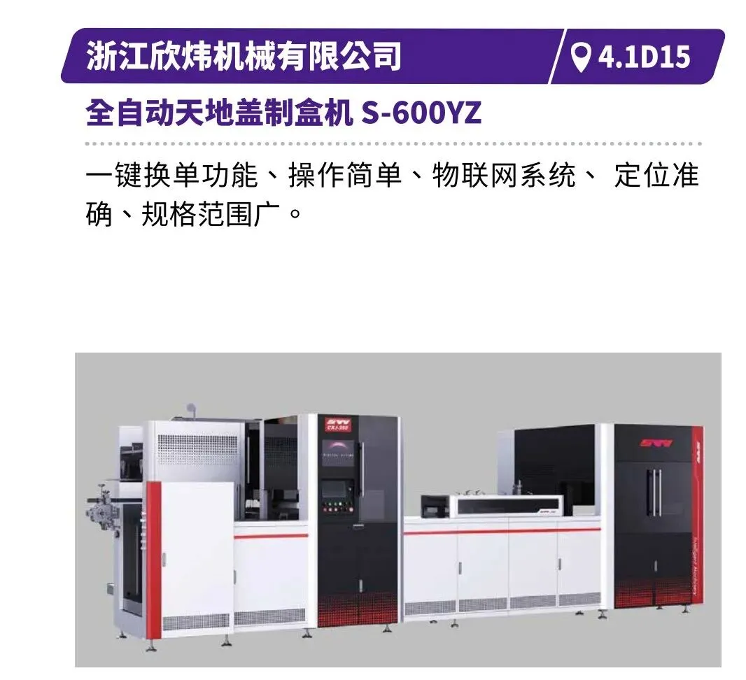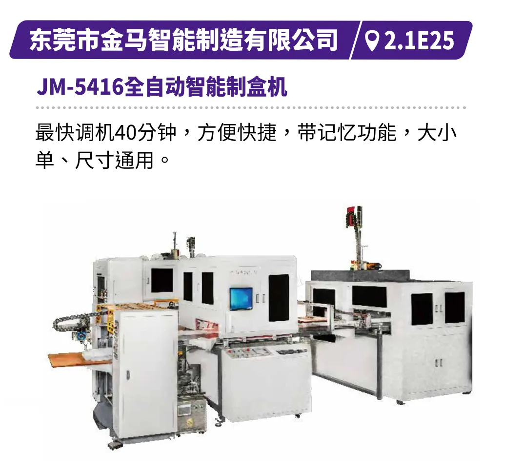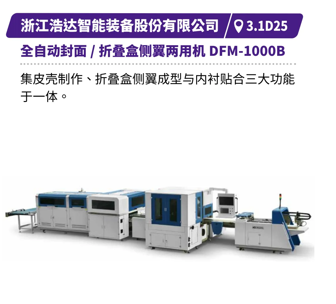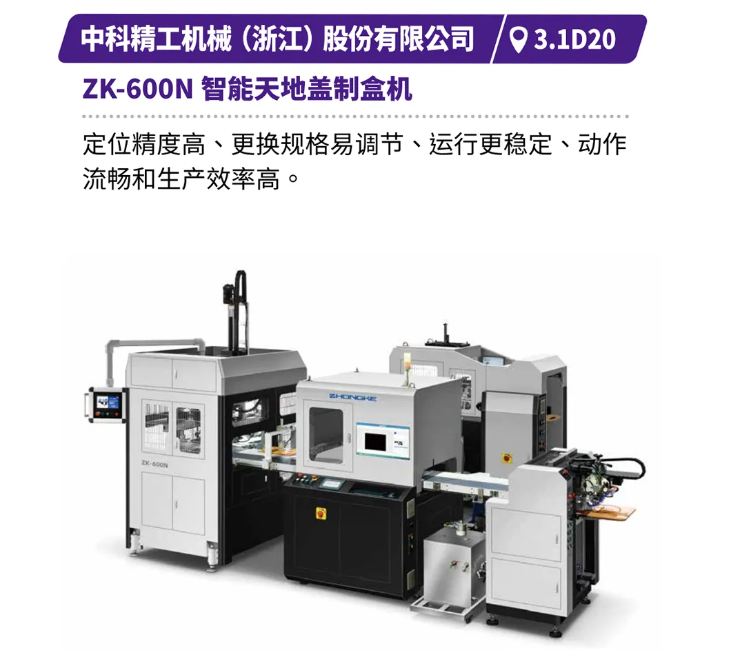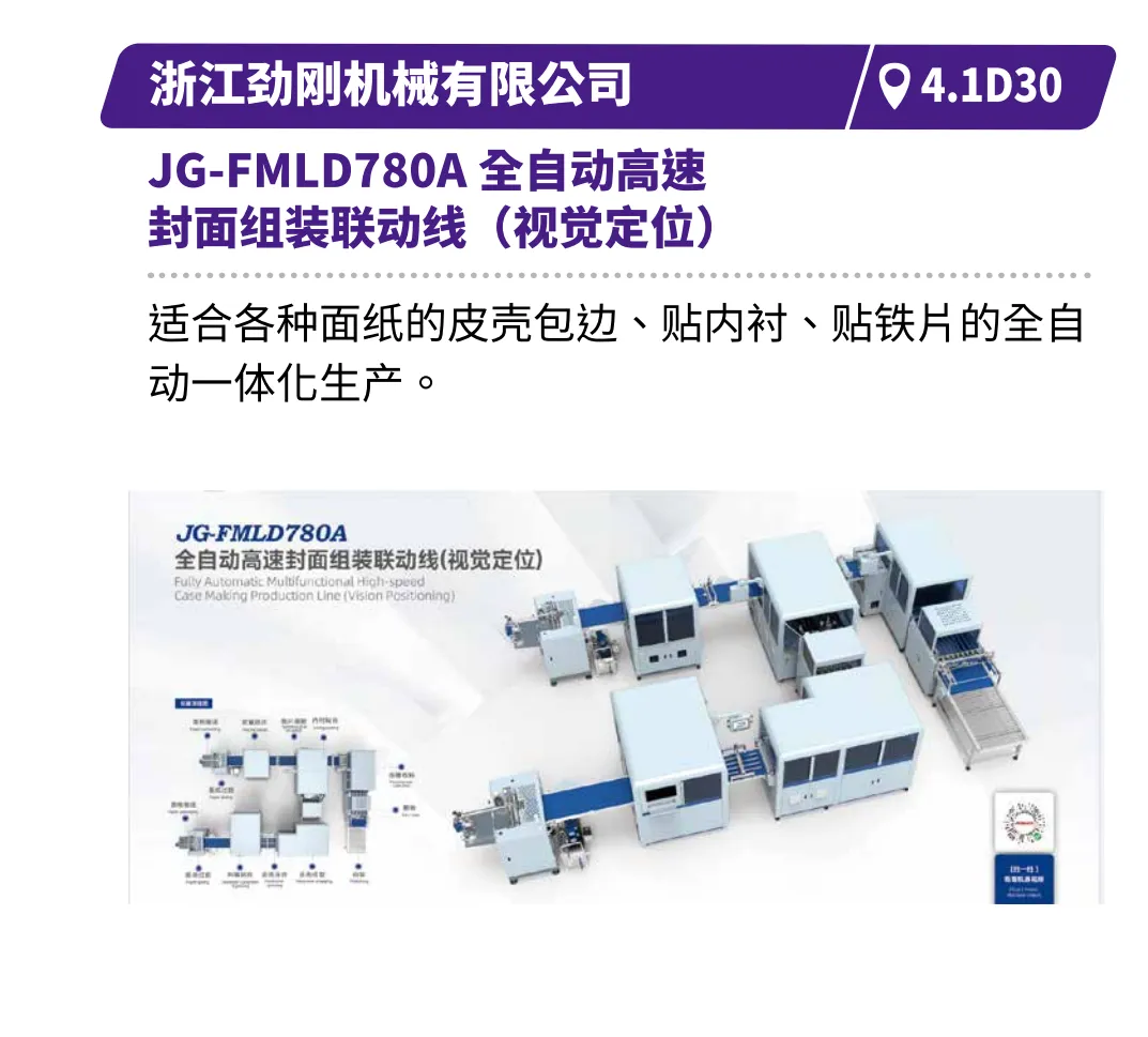 现场直击浙江劲刚的全自动高速封面组装联动线,展现高效无缝的生产衔接,鸿铭的全自动制盒机、中科精工的智能天地盖制盒机体现精密制造与柔性生产的结合,诠释智能化在复杂工艺中的应用等。