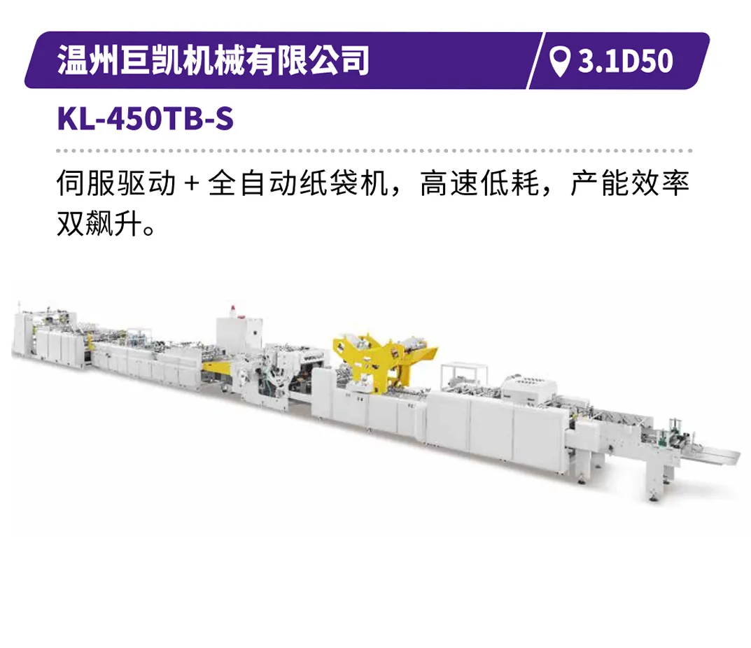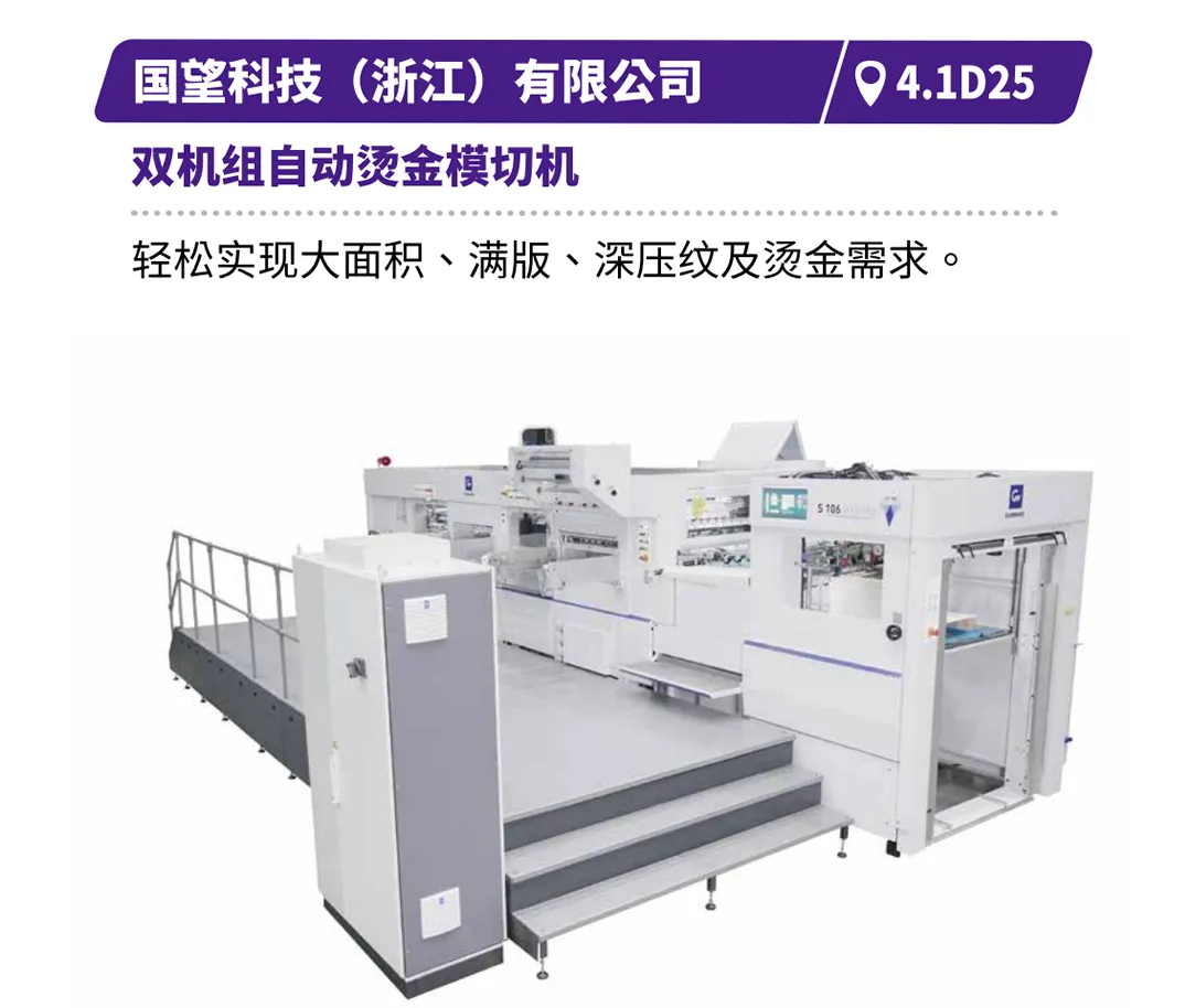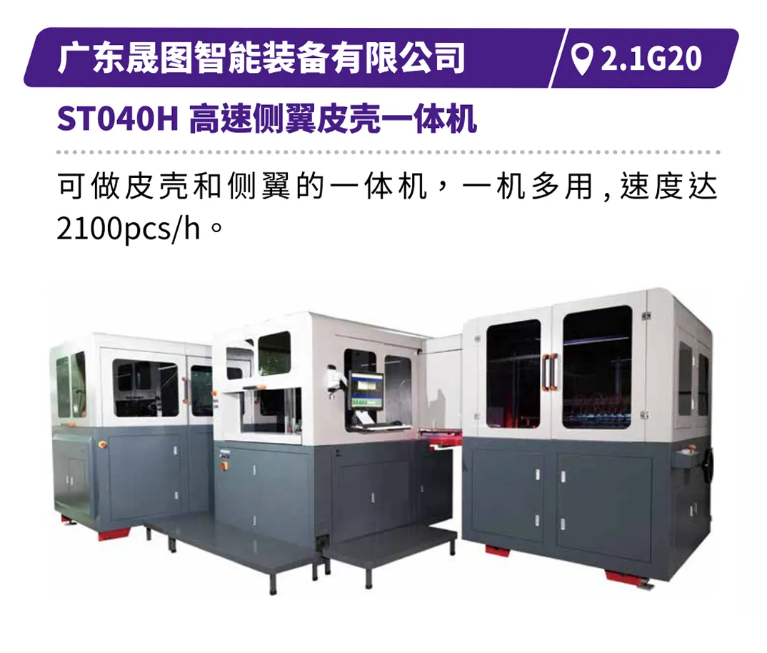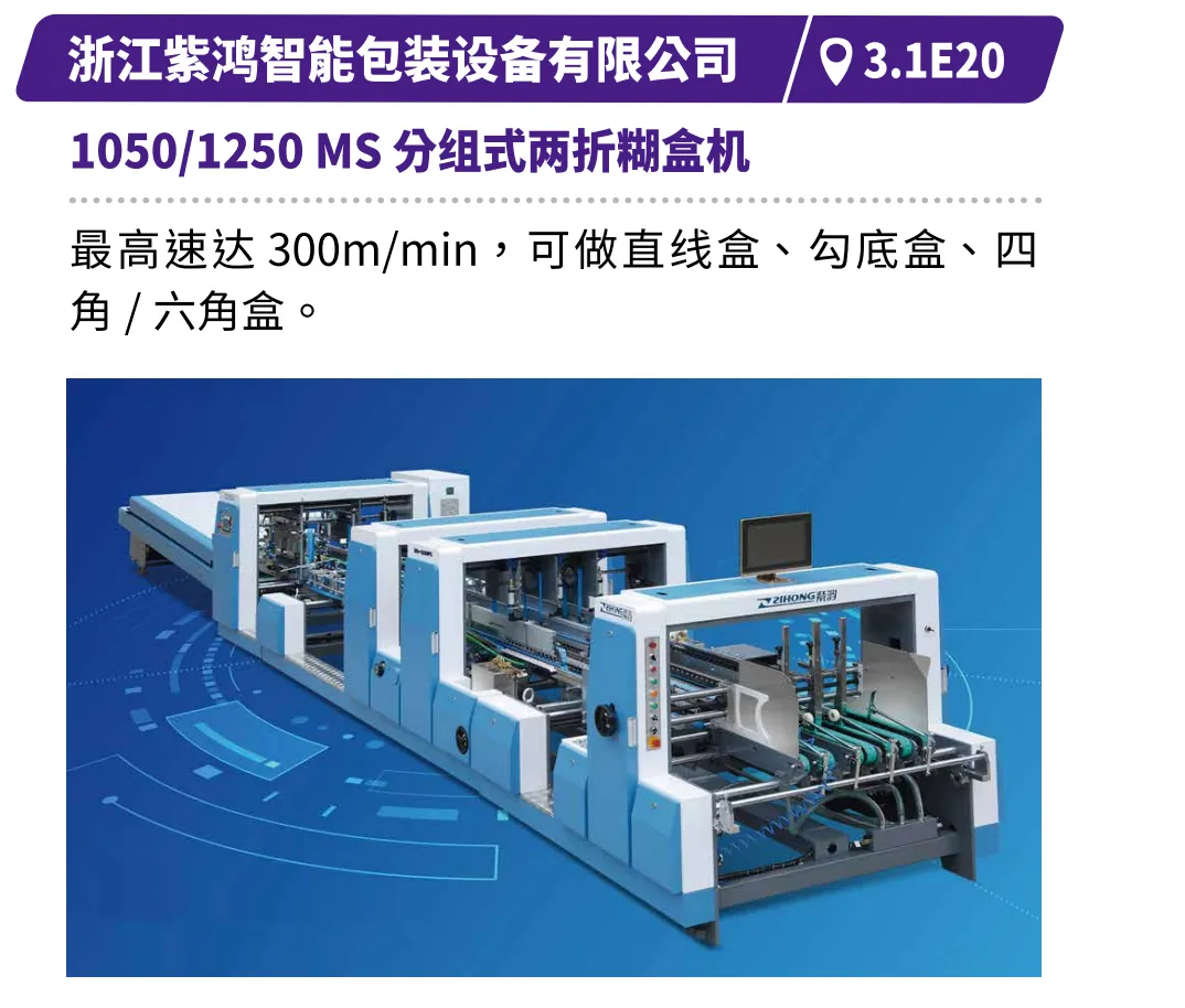 天津长荣的MK920DVF单张纸数字增效机,可实现一机多效,免制版、零废料、低人力依赖;国望科技的双机组自动烫金模切机,可轻松驾驭大面积满版深压纹与透金工艺;浙江劲豹的“全伺服网版印刷+丝网冷烫”设备,为包装赋予高附加值视觉与触感;浙江国威的智能裁切生产线,可实现全自动精准送纸与卸纸,大幅提升生产效率与稳定性。浙江紫鸿智能包装设备有限公司的1050/1250 MS 分组式两折糊盒机,可高速制作直线盒、勾底盒、四角盒、六角盒。 广东晟图智能装备有限公司的ST040H高速侧翼皮壳一体机,可一机多用,高速稳定制作皮壳和侧翼。