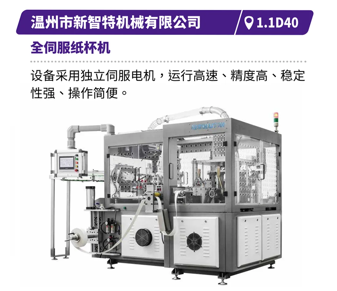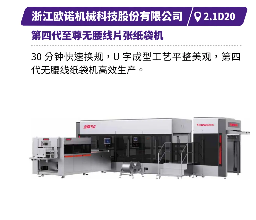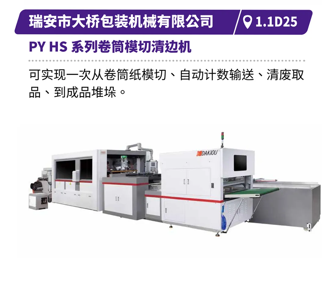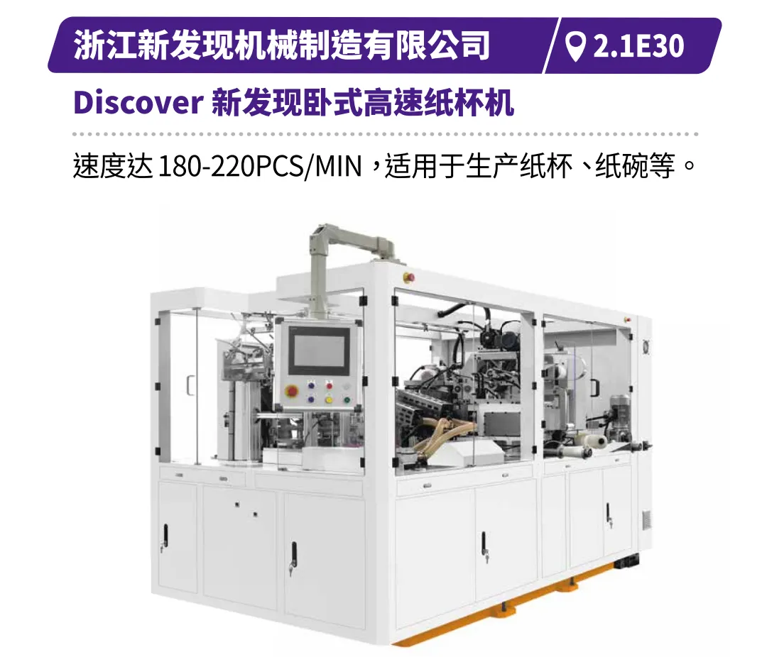 如浙江正博的腾T180机型,以柔性化与倍速生产力响应多样化订单;浙江欧诺的第四代无腰线片张纸袋机,凭借快速换规与U字成型工艺,兼顾效率与美学;江苏方邦的全伺服卷筒纸自动方底纸袋机,以数字化驱动提升生产精度与稳定性;芜湖袋王的全自动手提袋制袋机,以高可靠性与终身质保承诺,保障企业持续运转。瑞安市大桥包装机械有限公司的PY HS系列卷筒模切清边机,可实现一次从卷筒纸模切、自动计数输送、清废取品、到成品堆垛,高能高效。浙江新发现机械制造有限公司的Discover新发现卧式高速纸杯机,可高速生产冷热饮纸杯,以及泡面碗、汤碗等纸碗,一机搞定各种“杯”“碗”。