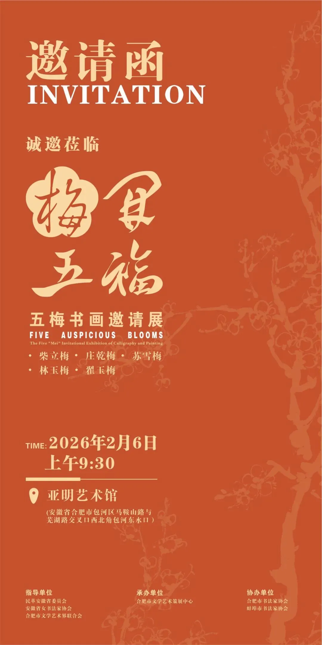 本次“梅开五福——五梅书画作品邀请展”,特邀五位才情卓越、名中含“梅”的女性艺术家:柴立梅、庄乾梅、苏雪梅、林玉梅、翟玉梅。她们的艺术足迹南北贯通。正如柴立梅老师所述:“五梅”的所在地,自南而北连成一线,犹如一根虬劲的梅枝,枝上的五苞正待放,期待绚烂,却求暗香阵阵……