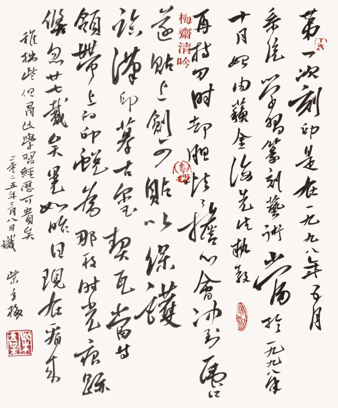 此次展览汇集了五位艺术家的国画、书法、篆刻等多元艺术形式,全面展现了她们在艺术道路上的不懈探索与深厚造诣。她们以作品与实践,共同诠释了梅花的淡雅风骨与高洁品格。这既是一次艺术成果的集中展示,也是一次艺术精神的接续与弘扬。