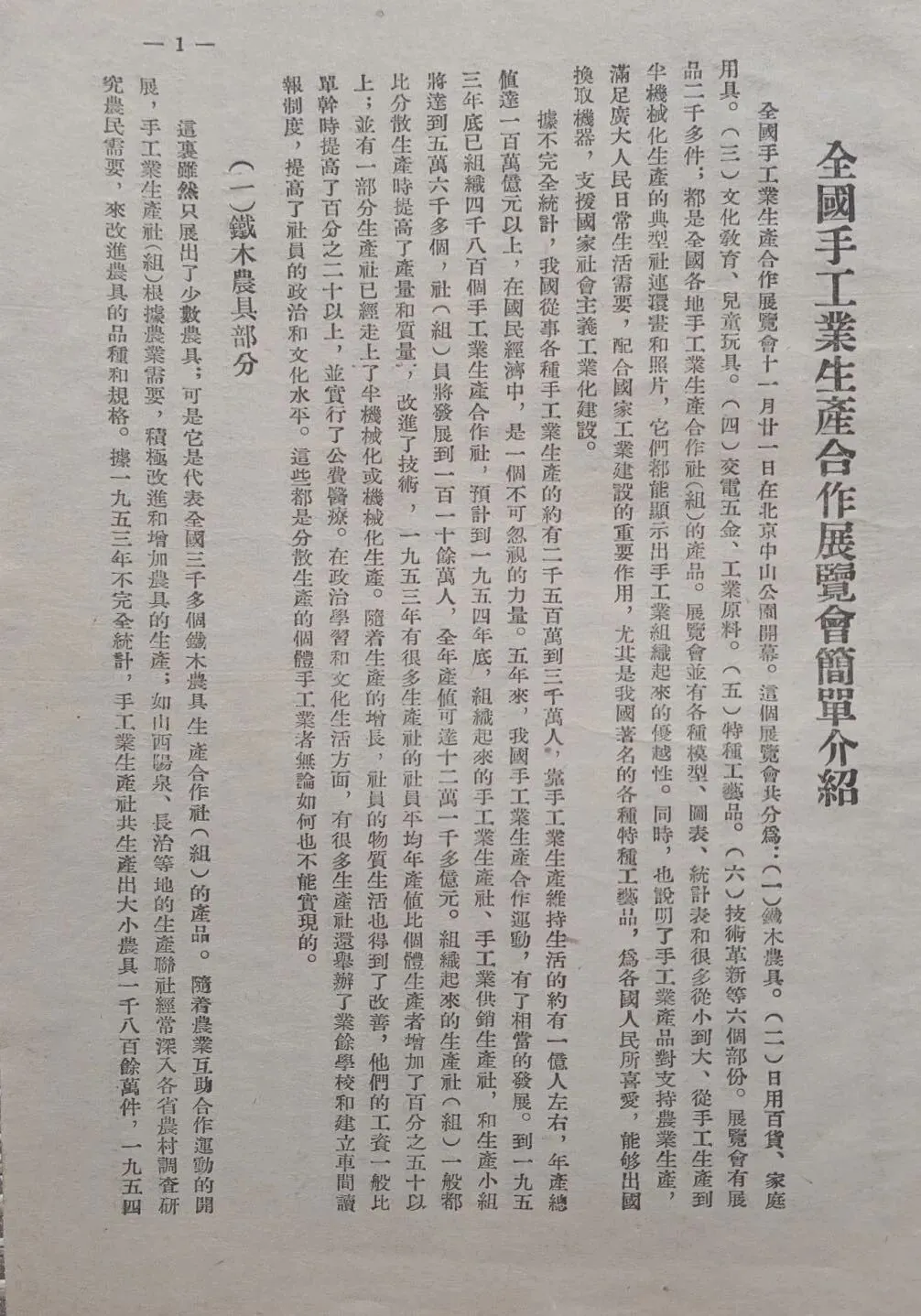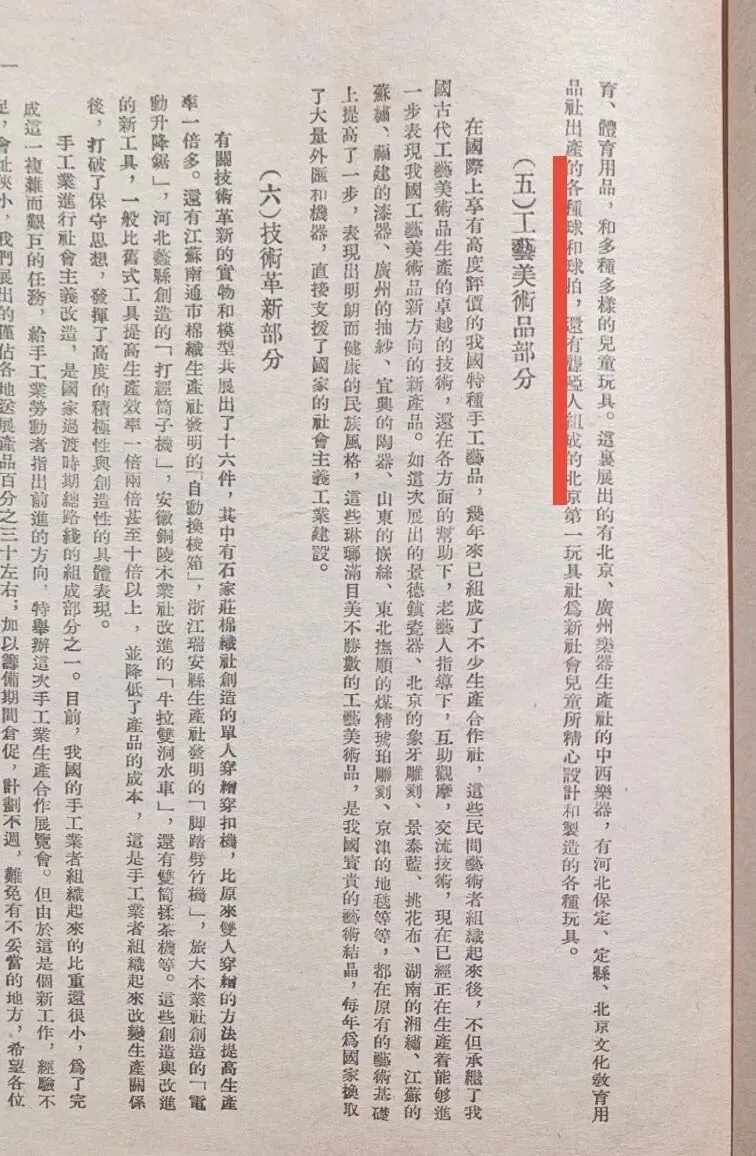 在国际上享有高度评价的我国特种手工艺品,几年来已组成了不少生产合作社,这些民间艺术者组织起来后,不但承继了我国古代工艺美术品生产的卓越的技术,还在各方面的帮助下,老艺人指导下,互助观摩,交流技术,现在已经正在生产着能够进一步表现我国工艺美术品新方向的新产品。如这次展出的景德镇瓷器、北京的象牙雕刻、景泰蓝、挑花布、湖南的湘绣、江苏的苏绣、福建的漆器、广州的抽纱、宜兴的陶器、山东的嵌丝、东北抚顺的煤精琥珀雕刻、京津的地毯等等,都在原有的艺术基础上提高了一步,表现出明朗而健康的民族风格,这些琳琅满目美不胜数的工艺美术品,是我国宝贵的艺术结晶,每年为国家换取了大量外汇和机器,直接支援了国家的社会主义工业建设。