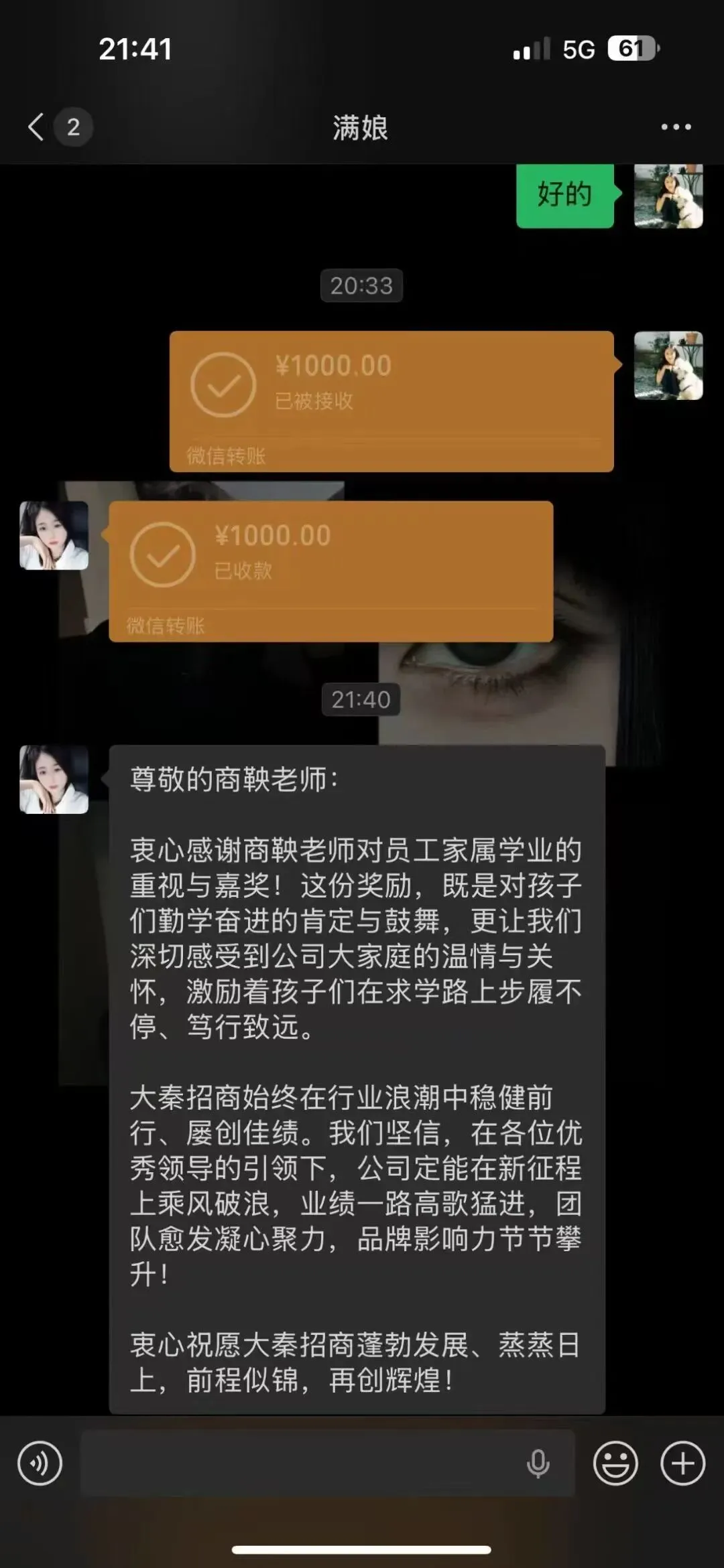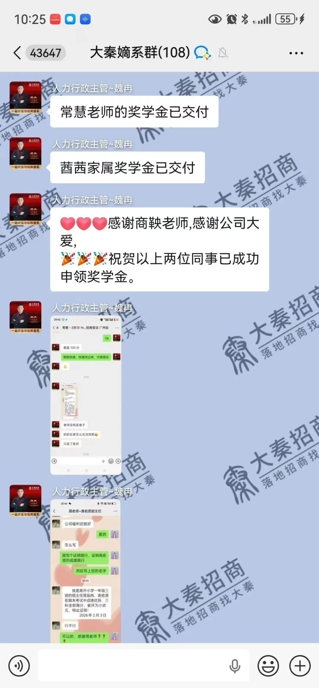 大秦隐藏福利,也是其他公司没有的,每个伙伴家的小孩,只要考试成绩好的,就可以拿到1000元大秦奖学金。