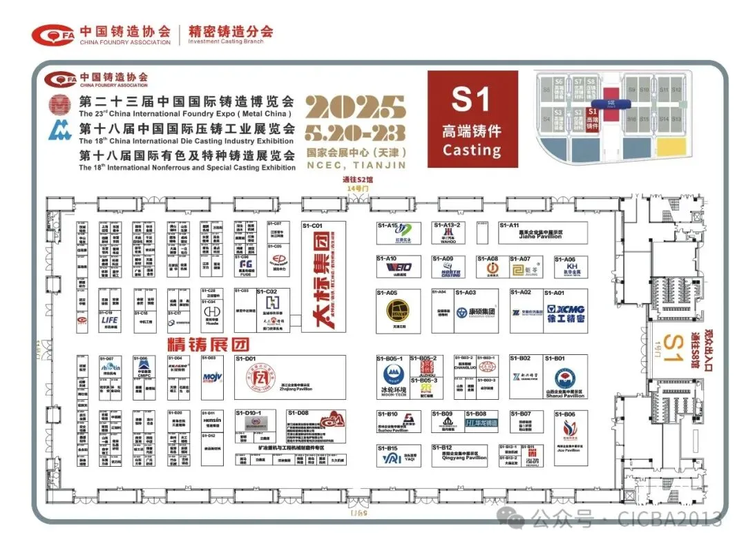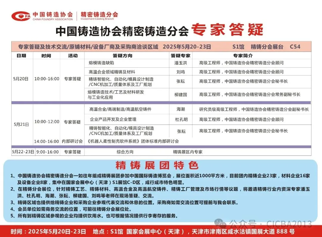 中国铸造协会精密铸造分会今年再次组成精铸展团参加中国国际铸造博览会,展位面积近1000平方米,集中在国家会展中心(天津)S1展馆C-D区,成行成市特色明显,精铸件生产企业,连同精铸原辅材料及设备企业,以精密铸造产品的内涵、特性与应用领域为切入点,向广大专业观众生动展现传统铸造产业如何达成高质量发展与技术革命的深度融合,助力观众洞悉行业前沿趋势与创新路径。