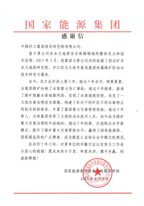 基于全流程一体化防治水技术服务,西安研究院与国家能源集团、鄂尔多斯市政府、山西焦煤霍州煤电公司等煤矿企业或政府共同组建煤矿防治水技术研究和指导机构,提供专业式、专家式、一站式、点对点式等服务模式,并将发展“家庭医生式”“远程平台式”的一体化技术服务模式,以更好地替政府解忧、为企业解困。以西北矿井水文地质研究院为代表的众多合作机构帮助各服务矿井有效杜绝了重大水灾伤亡事故,得到政府监管部门及企业的高度认可和由衷称赞。
