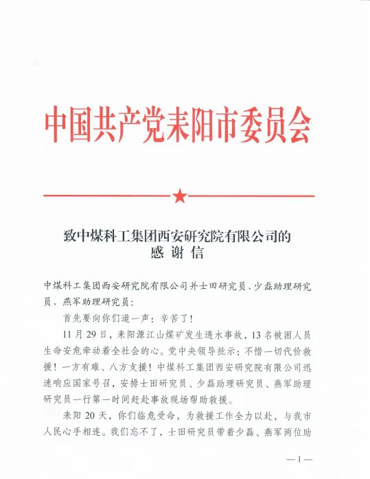 西安研究院承担了全国90%以上煤矿特大型突水灾害抢险救援与治理任务,形成了动水大通道突水钻孔控制注浆封堵、导水陷落柱反过滤快速注浆封堵、导水通道快速精准探查等抢险救援和治理关键技术,为矿山突水事故安全、快速、高效抢险救援提供技术支撑。在内蒙古骆驼山矿、四川杉木树矿、湖南耒阳源江山矿、新疆丰源矿等众多突水事故的抢险救援与治理中发挥了中流砥柱的作用,充分彰显中央企业的责任和担当。