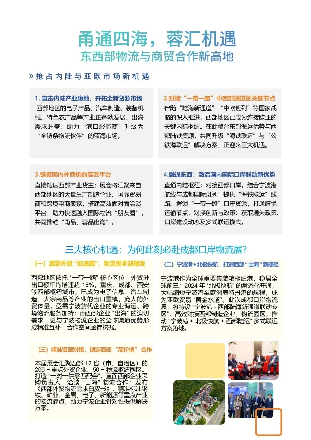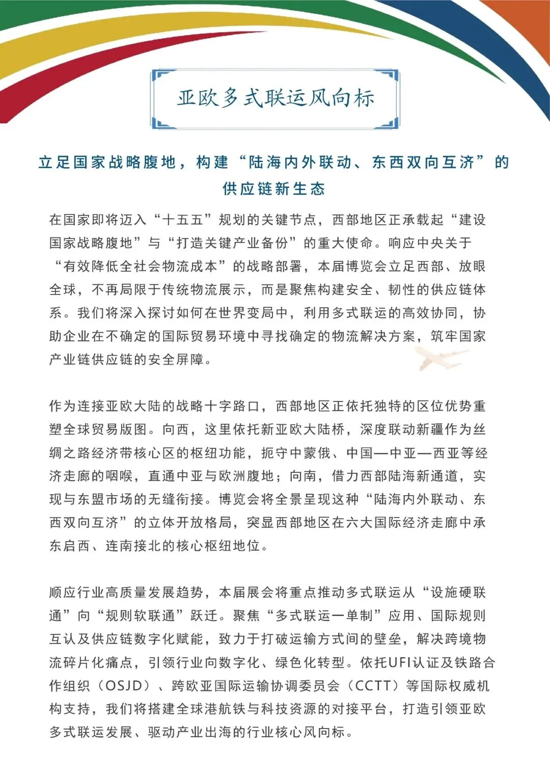 国际供应链与口岸物流博览会具有强烈的内陆开放和“一带一路” 色彩,它是中国境内唯一覆盖“海陆空铁”全模式且获得UFI认证的相关展会,致力于成为亚欧多式联运的风向标。其展示重点在于连接上合组织、东盟、中西亚、中东欧的物流通道与技术。展品涵盖口岸技术装备、多式联运设施、智慧物流、跨境电商物流、物流装备技术等。