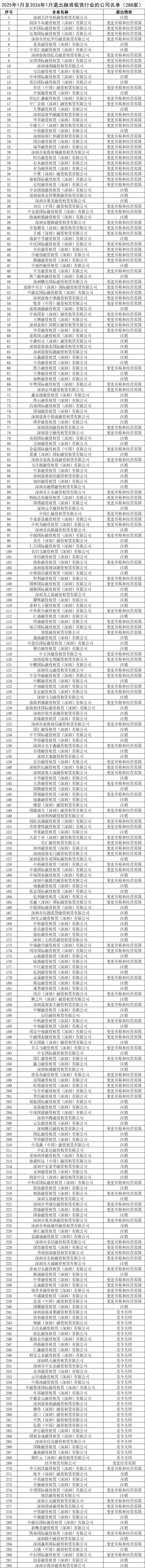 附件:2025年1月至2026年1月退出融资租赁行业的公司名单
