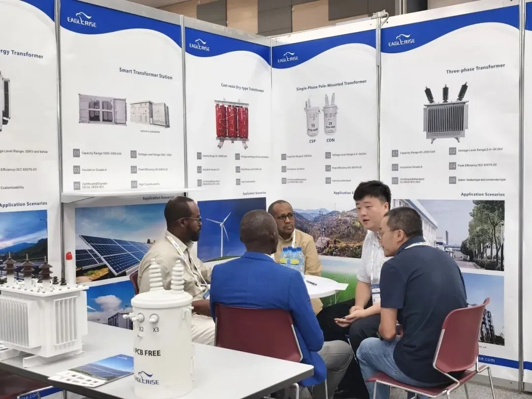 Eaglerise showcased a range of advanced products, including new energy step-up transformers, new energy intelligent compact substations, and distribution transformers. The exhibition highlighted customized product series and solutions tailored for the African market, aiming to support local renewable energy infrastructure development and energy structure transformation.