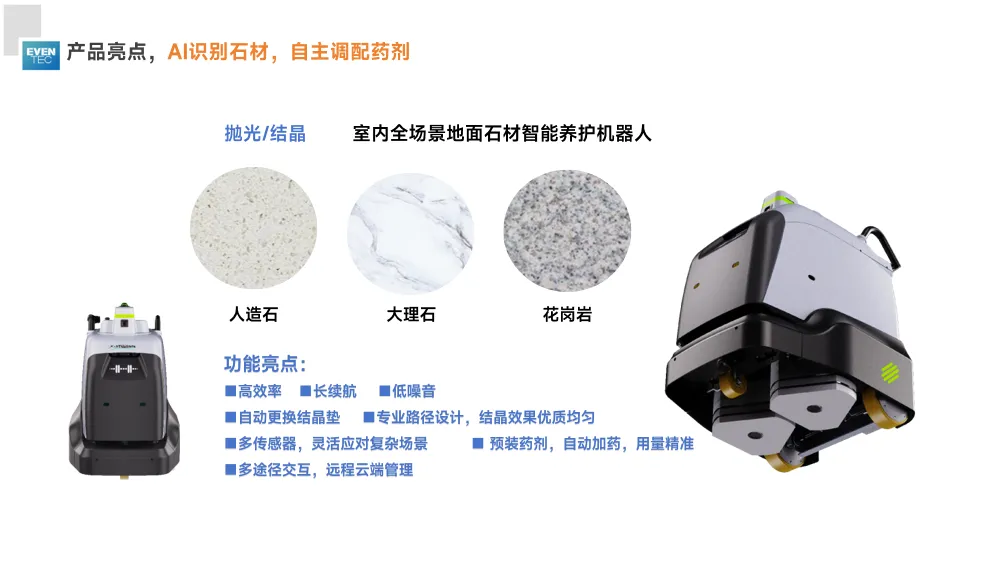 越凡创新深耕全自主服务机器人领域,曾参与制定10余项行业标准,产品矩阵覆盖智慧零售、末端配送等领域的全功能服务机器人。最新产品石材养护机器人“晶墩墩”适用于商场、写字楼、酒店等大面积石材场景,可对天然大理石等多种材质地面进行结晶、抛光等作业,避障精度±2mm,效率达人工8倍,可降低石材损伤风险,延长石材生命周期,为商圈提供高效智能的智慧服务升级方案。