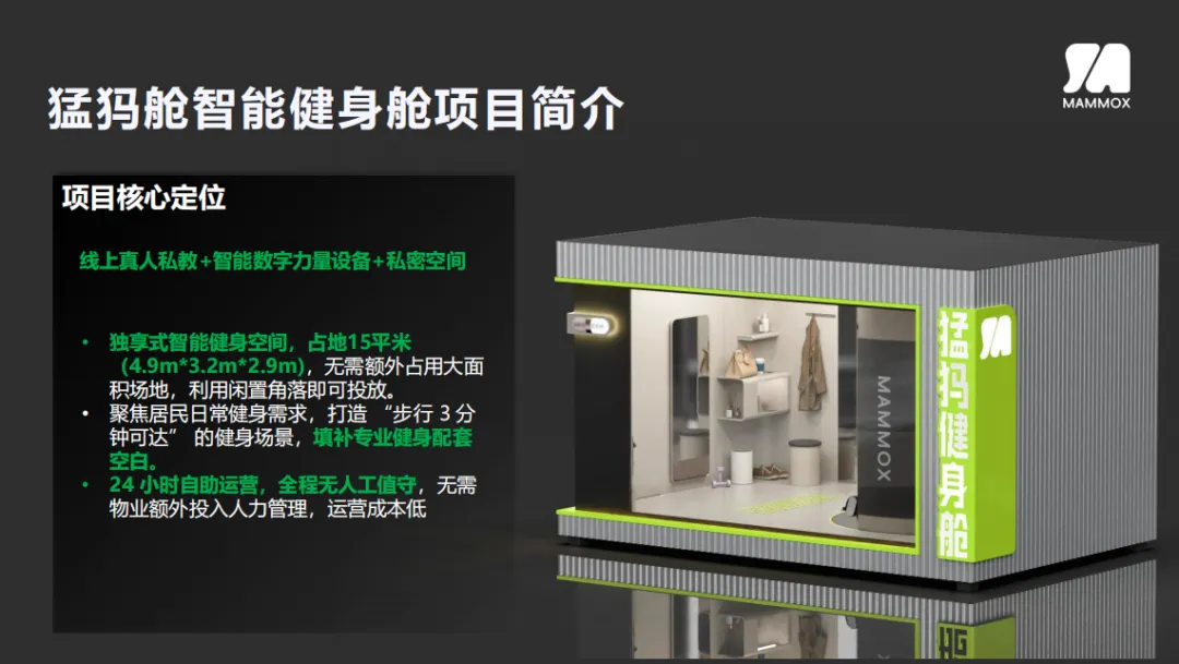 猛犸舱体育在智能健身硬件、人工智能算法领域拥有深厚积累,其带来的15平米“猛犸智能私教舱”,配备可远程调控的数字力量设备,线上专业教练实时互动指导,将以“小空间大功能”的高效健身新模式,为商圈注入未来健康消费新活力。