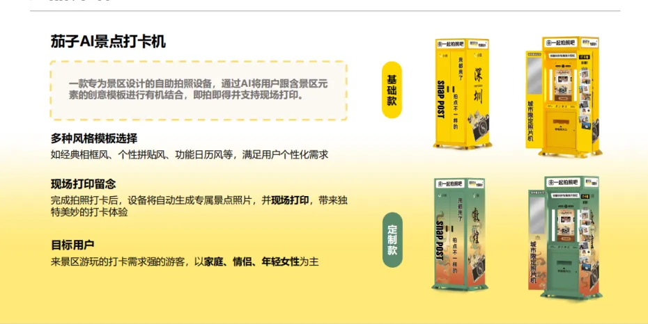 小铁科技凭借“物联网+人工智能”技术优势,其自研AIGC技术的智能自助拍照设备,具备人物与场景AI融合生成能力,支持多风格模板与即时打印功能,通过定制化适配商圈文旅场景,为用户提供个性化、高品质的旅行纪念影像。