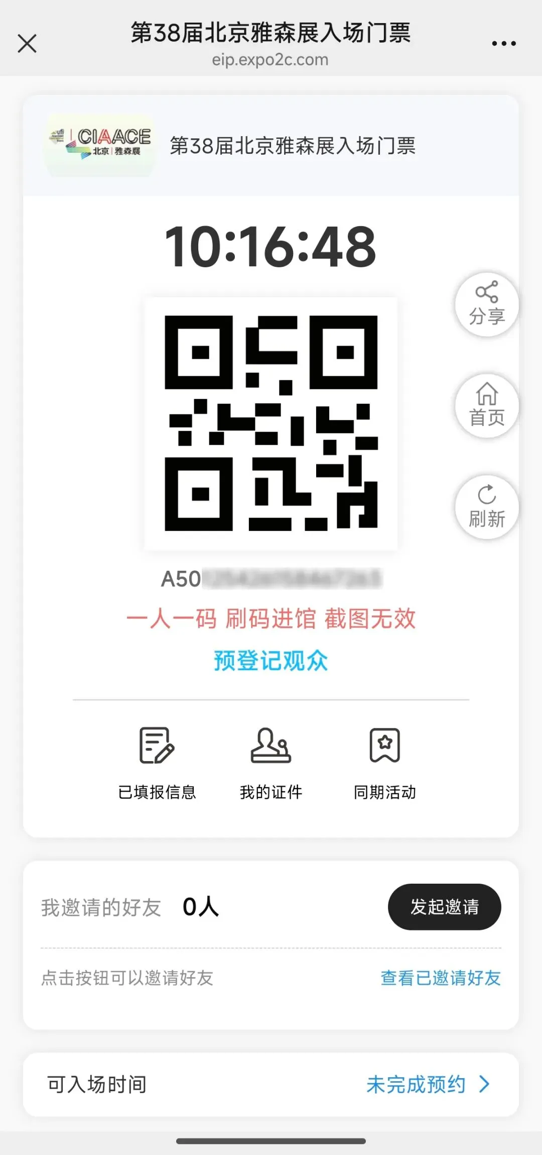1. 预登记信息成功提交后,会显示您的专属预登记二维码,建议您妥善收藏本链接;您也可随时在【我的证件】中查看门票,点击【同期活动】及时登记您喜欢的活动。
