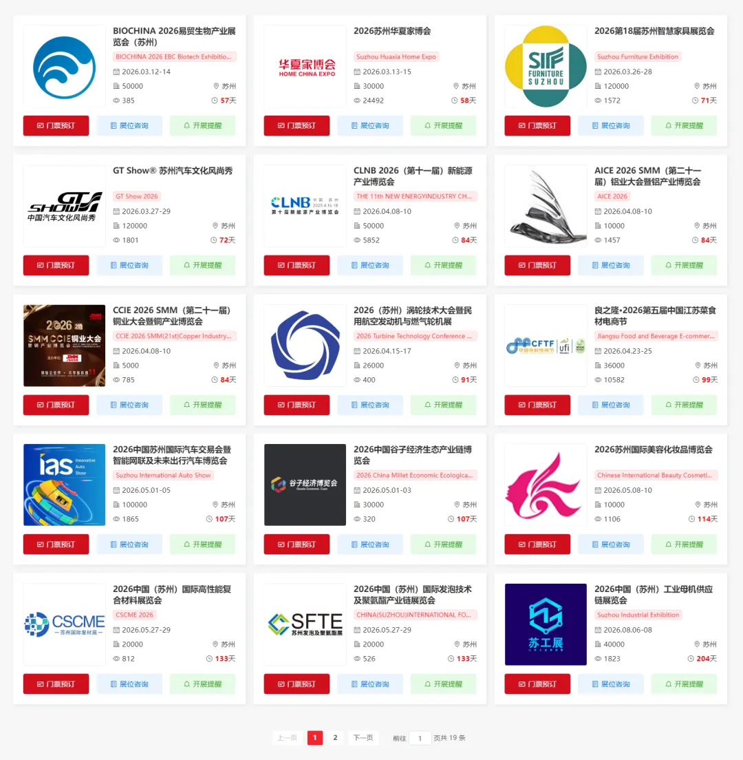2026年苏州将举办多场重要的展会活动,涵盖了生物、家具、改装车、工业、能源、动力传动、数字经济、美容、复合材料、新材料、机床、医疗器械、制药、橡塑展等多个领域。小编为大家整理了2026苏州展会排期表,希望能帮助你规划行程。末文获取苏州展会门票预约入口~(大多展会门票限时免费)