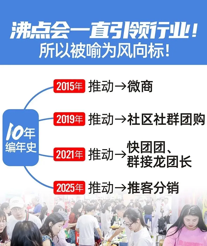 从2015年推动微商发展,到2019年聚焦社区社群团购,再到2021年助力群接龙、快团团团长成长,2025年引领推客分销热潮,沸点会创立十多年以来,见证并引领了私域领域的四个商业周期,早已成为行业公认的风向标。