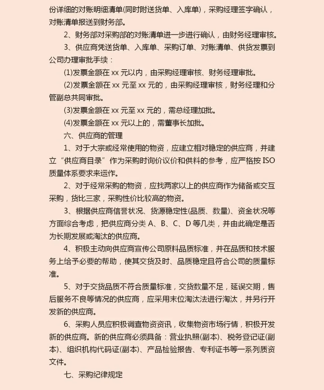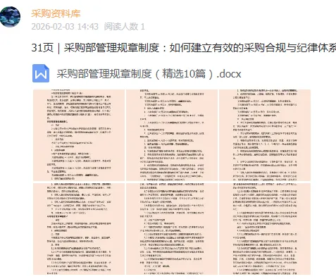 大家好,这里是“采购圈文库”微信公众号,为大家分享采购.仓储.生产.供应链.质量等实用干货资料。关注我并将公众号设置星标,避免错过最新资料下载!一份完整的采购部管理规章制度,其价值远不止于文本的堆砌。它是一套精密运转的操作系统,直接关系到企业成本控制、供应稳定与合规安全。翻阅十篇精选制度样本,你会发现,高水准的采购管理,核心在于将分散的权责、流动的物资与交织的资金,通过清晰的规则编织成一张稳定而高效的网络。完整版以上传星球,想要一次性获取的小伙伴,加入下方星球即可 如何获取更多资料下载?