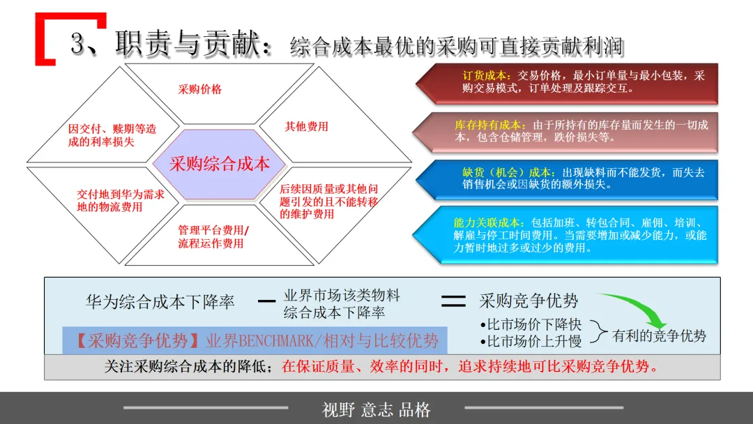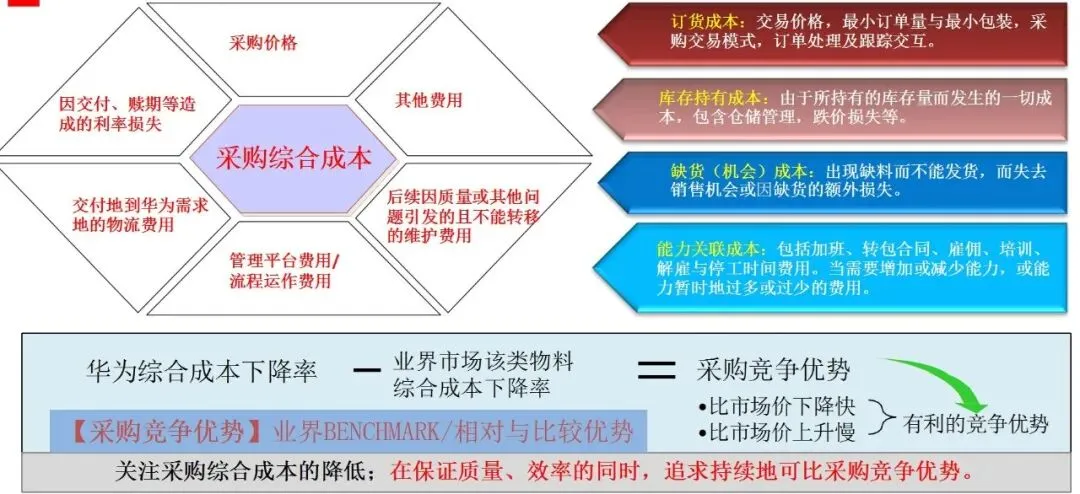 这套机制更深层的价值,在于它管理“总拥有成本”的精密性。它将对成本的关注,从狭隘的“采购价格”升维至涵盖物流、库存、质保、机会成本甚至能力波动的全频谱模型。通过持续对比“华为综合成本下降率”与“业界市场下降率”,采购绩效被锚定在获取相对竞争优势上。这使得采购行为从被动的成本执行,转变为主动的价值创造与利润贡献。