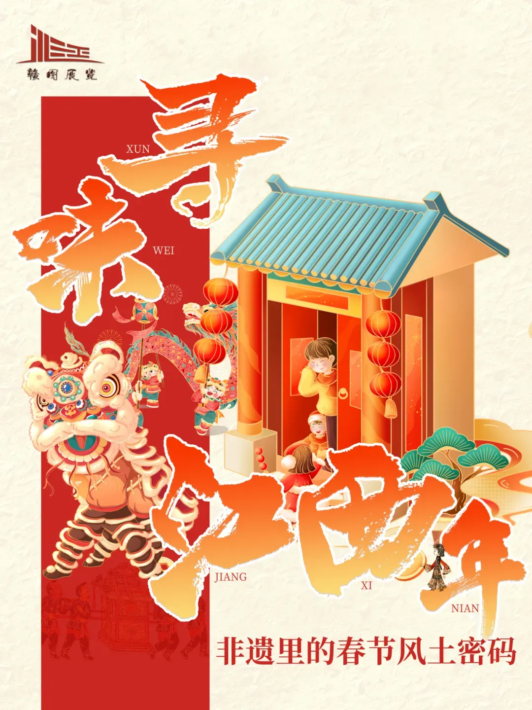 春节,是铭刻在中华血脉中的共同记忆,却在每一方水土中,生长出独具魅力的风姿。江西的春节,是一场以非遗为笔、以乡情为墨绘就的瑰丽长卷。本次展览邀您开启一场“寻味”之旅,穿越璀璨的灯海与雄健的舞步,解码古老仪式中蕴含的天地敬畏、宗族温情与生活智慧,感受这片土地上最深沉、最鲜活的文化脉搏。