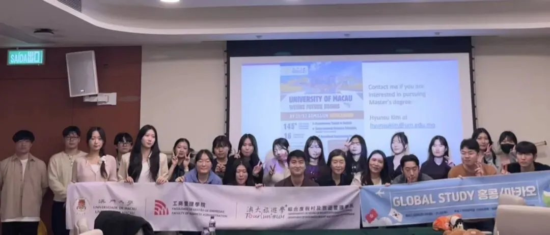 在澳門大學的酒店實驗室,代表團受到澳門大學綜合度假村及旅遊管理學系系主任苗莉教授(Prof. Li MIAO)的熱情歡迎。隨後,Assistant Professor Hyunsu Kim為來訪師生帶來了一場題為《澳門會展產業》的專題講座。他不僅深入解析了澳門會展業的發展現狀,還重點介紹了澳門特別行政區的「1+4」經濟多元化戰略——即在博彩業之外,推動會展業成為高價值旅遊與知識交流的全球引擎。