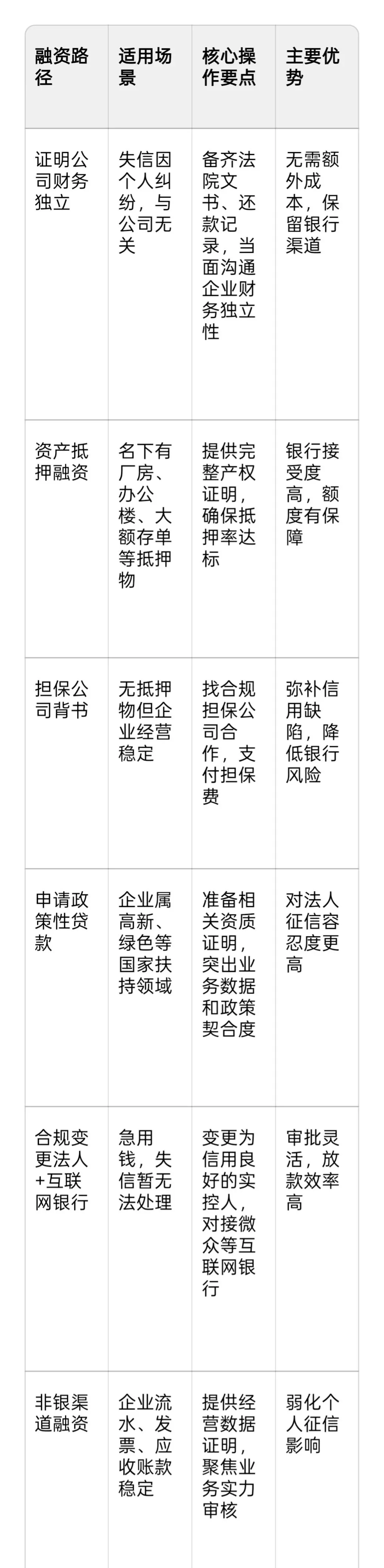 如果你现在急着用钱,等不及处理失信,可以考虑合规变更法人,把法人换成信用好的实控人,虽然有些银行要看变更满半年,但像微众这类互联网银行,灵活性会高很多,再就是走非银渠道,关注你的流水,发票和应收账款,这些机构看重的是你生意好不好,而不是你个人欠了谁钱。