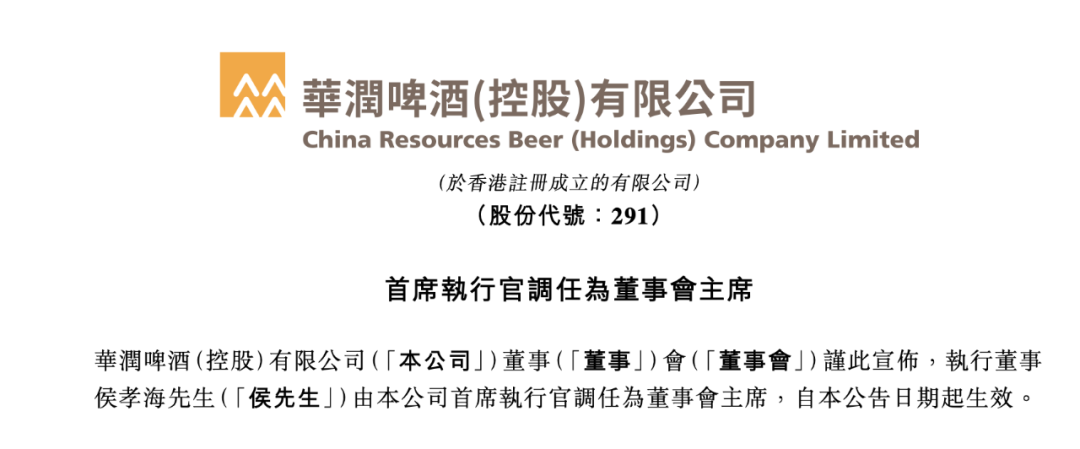 4月20日,华润啤酒在港交所公告,执行董事侯孝海由首席执行官调任为董事会主席,自公告日期起生效。