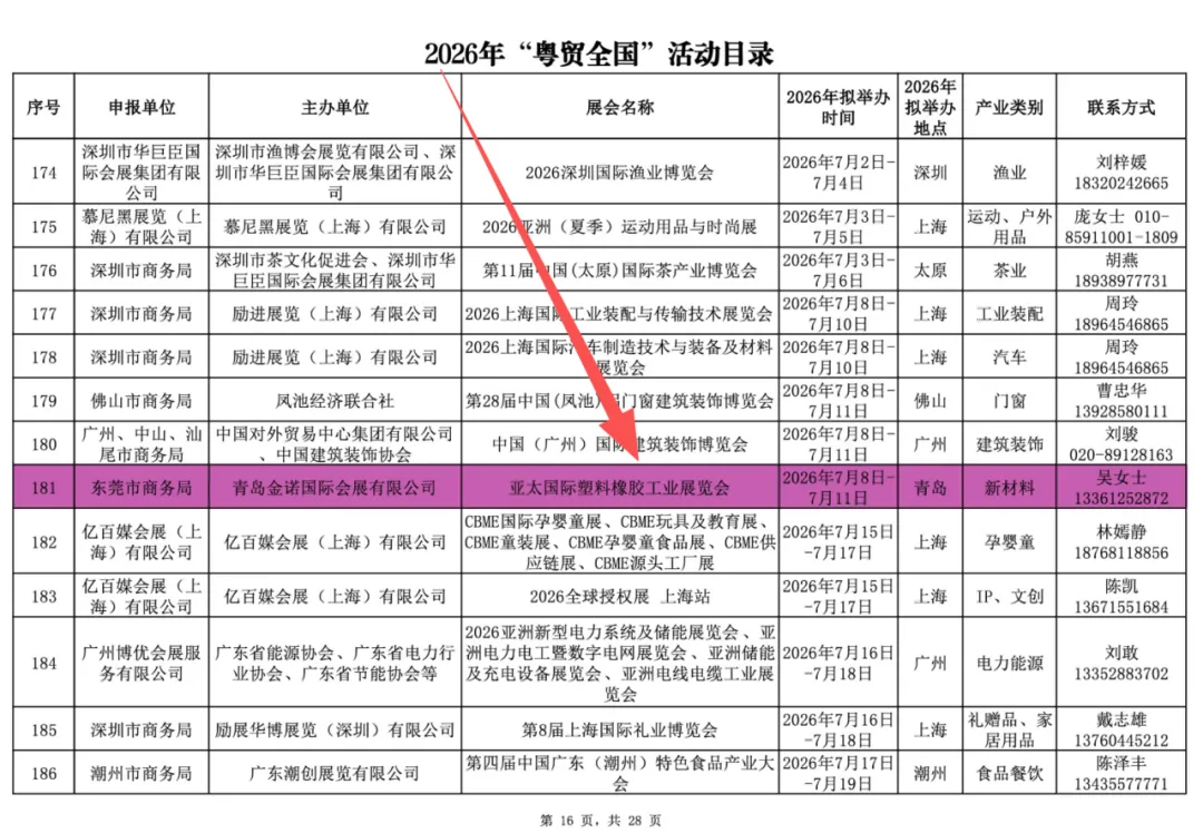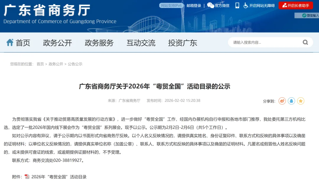 近日,广东省商务厅正式印发《关于2026年“粤贸全国”活动目录的公示》