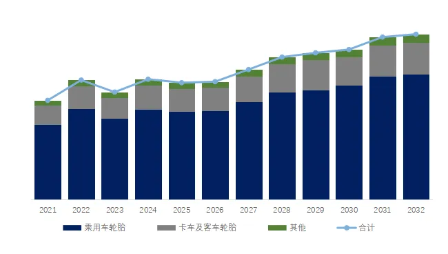 就产品应用而言,目前乘用车轮胎是最主要的需求来源,占据大约75%的收入份额。随着全球对节能、低排放及行驶安全性要求的提高,在绿色轮胎及新能源车辆配套轮胎市场需求持续增长。