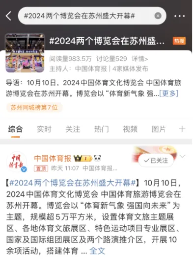 中央广播电视总台、新华社、人民日报、中国新闻社、央视网、人民网、新华网、中国教育电视台、中国体育报等20多家主流媒体、70多家省区市地方媒体以及30多家苏州媒体欢聚一堂,186位记者现场报道,展会三天累计新闻报道3800余条,全网信息浏览量破2亿,话题#2024两个博览会在苏州盛大开幕#上榜微博热搜前三,阅读量超983.5万,关注度空前。