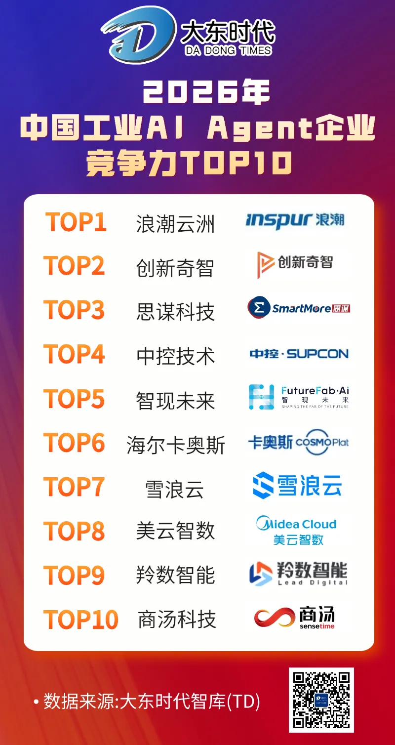 在产业深刻变革背景下,工业AI Agent的场景应用正迎来全面铺开的关键阶段。为此,大东时代智库(TD)基于对产业的长期追踪,聚焦于平台级与工艺级并重、提供开箱即用Agent能力、并深耕工业核心场景的企业,基于技术底座、商业化规模、产品形态、行业深耕、财务健康度五大核心维度进行分析,梳理出《2026年中国工业AI Agent企业竞争力TOP10》榜单,为产业链各方的技术选型、生态合作与战略决策提供参考。
