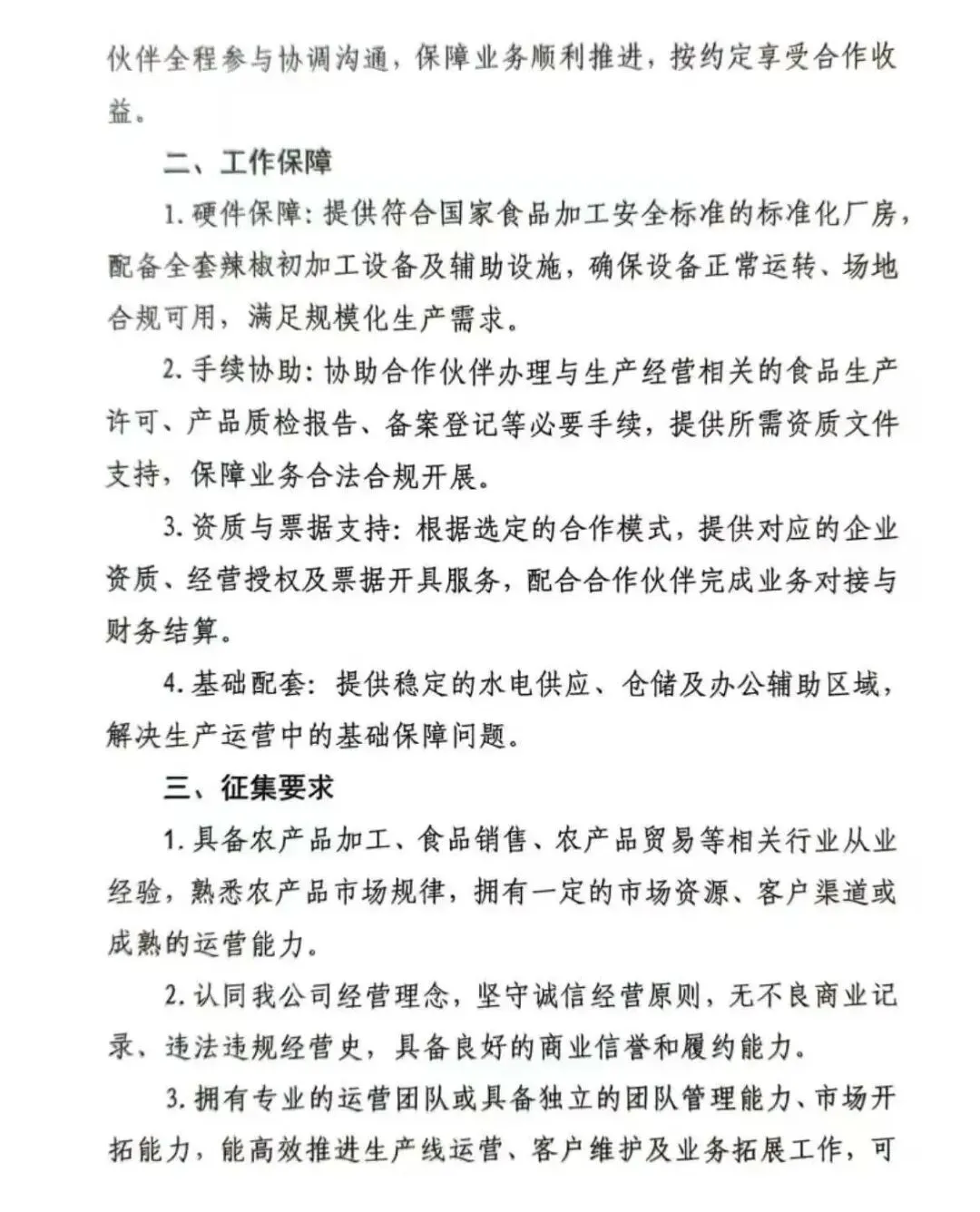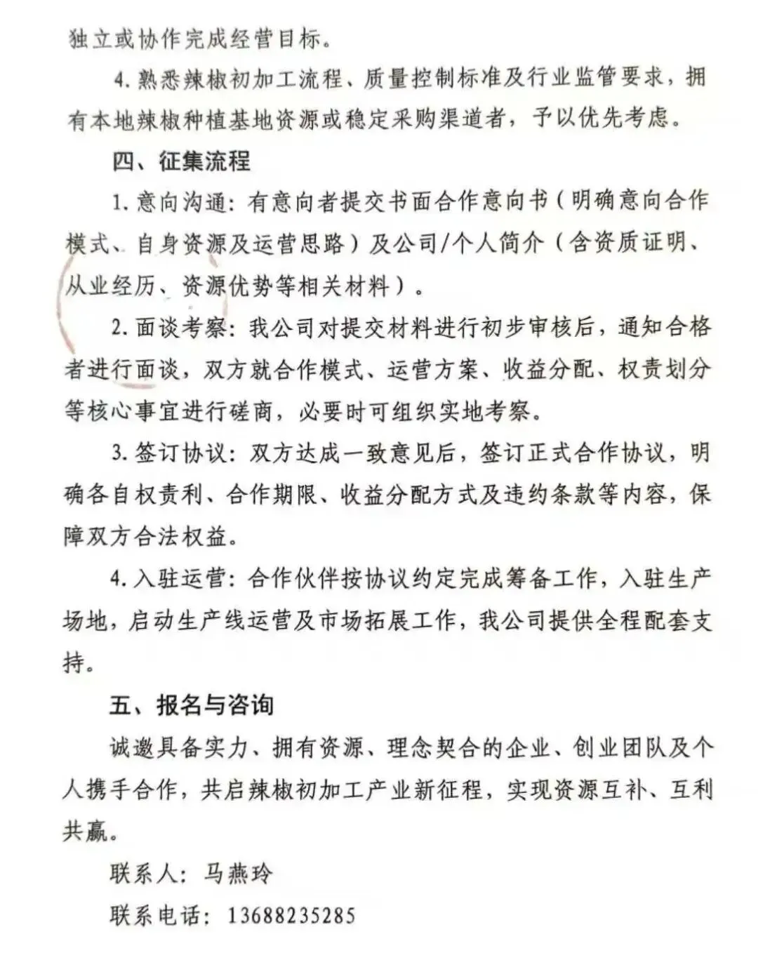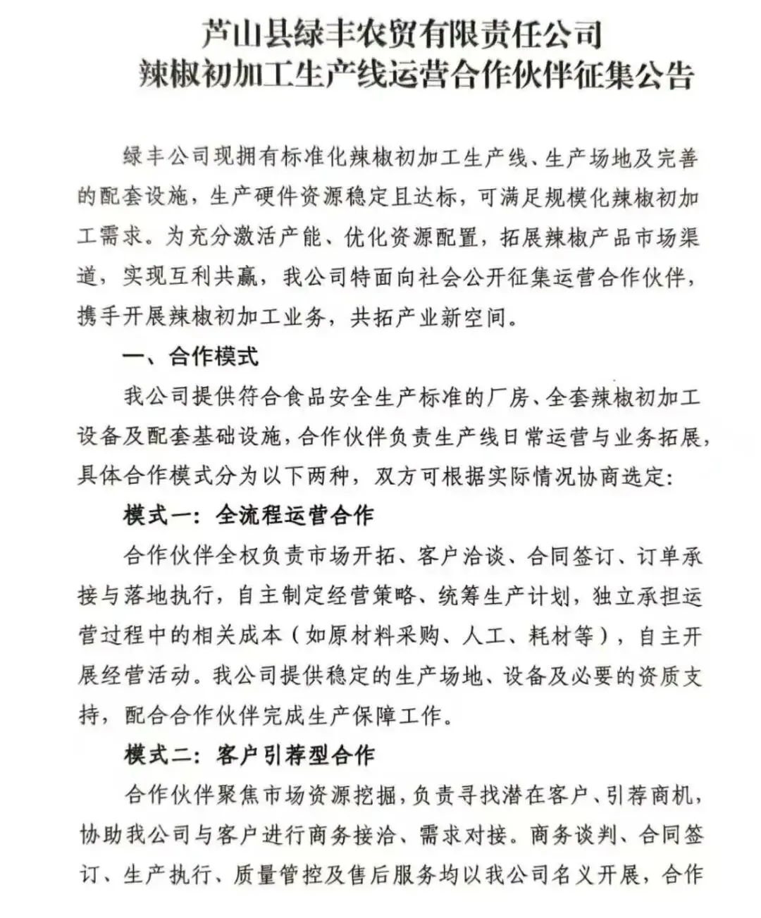 【征集公告】辣椒初加工生产线运营合作伙伴