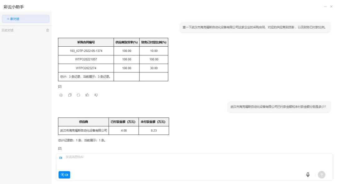 彩云AI大模型如何解决:在企业明确授权和安全边界内,我们部署了跨系统智能数据融合引擎。该引擎如同一位精通各系统语言的“超级翻译官”,能够理解并连接不同来源、不同结构的数据。当大模型需要回答一个问题时,它不再是调取单一数据库,而是并行发起指令,实时从采购记录、库存台账、生产工单、财务应付、审批流程等各个业务系统中抽取关键信息,并在内存中进行秒级的关联、对齐与整合。
