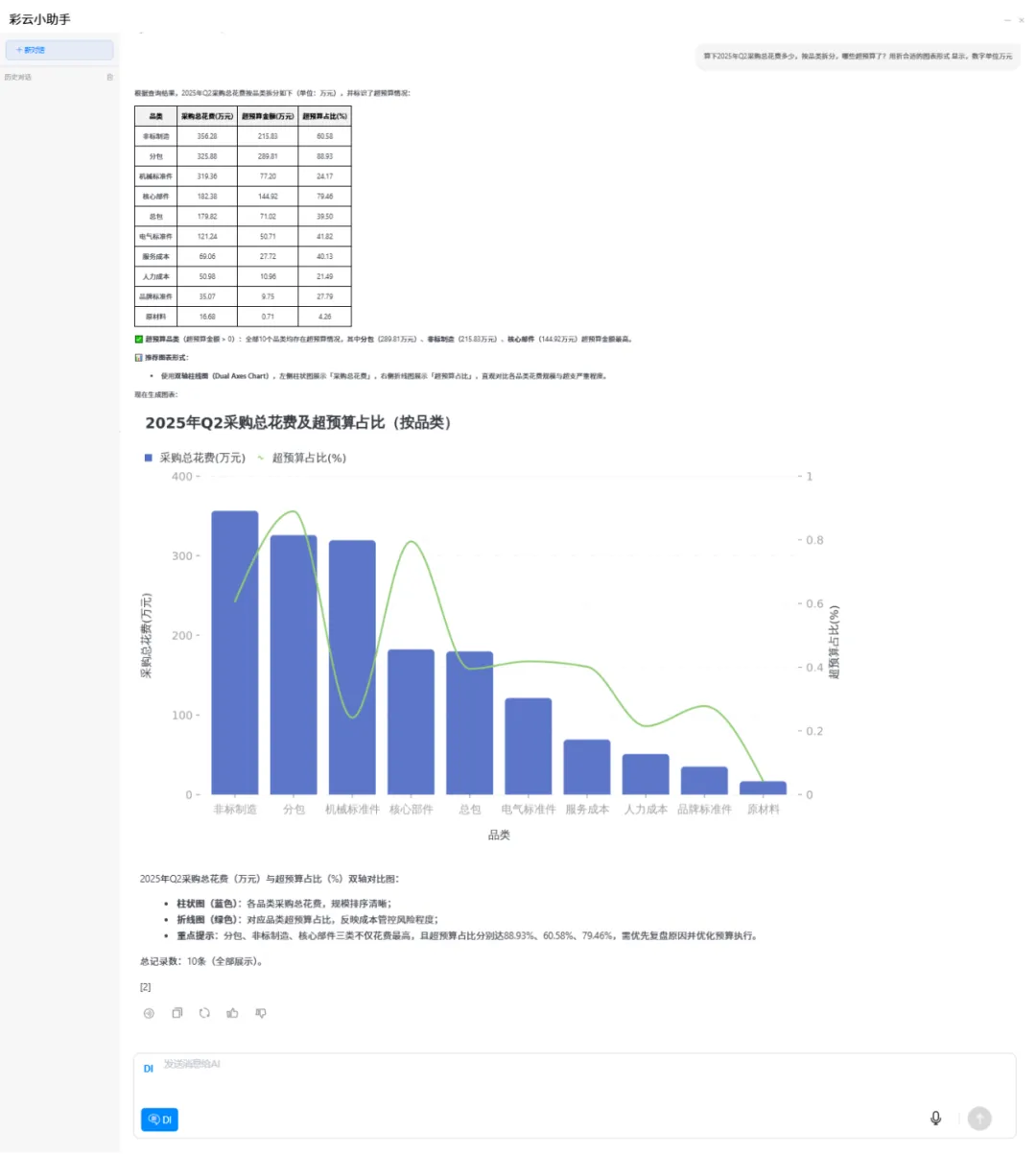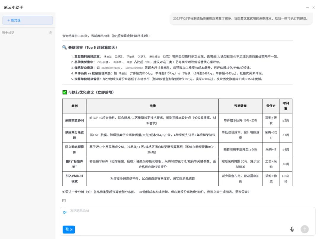 延续上述管理者的例子:当提出“2025年Q2采购成本追问降本建议”的需求后,大模型会先展示2025年Q2各品类采购花费与预算的对比数据,随后针对成本异常开展深度归因分析,精准提炼Top 5超预算核心洞察,为降本建议提供扎实依据。基于洞察,大模型同步输出可立即落地的优化建议及落地规划,而非单纯的数据表格,最终形成包含成本对比、根因分析、风险提示及落地方案的完整决策简报,直接支撑2025年Q2采购降本决策。