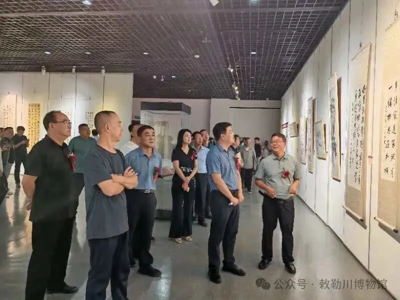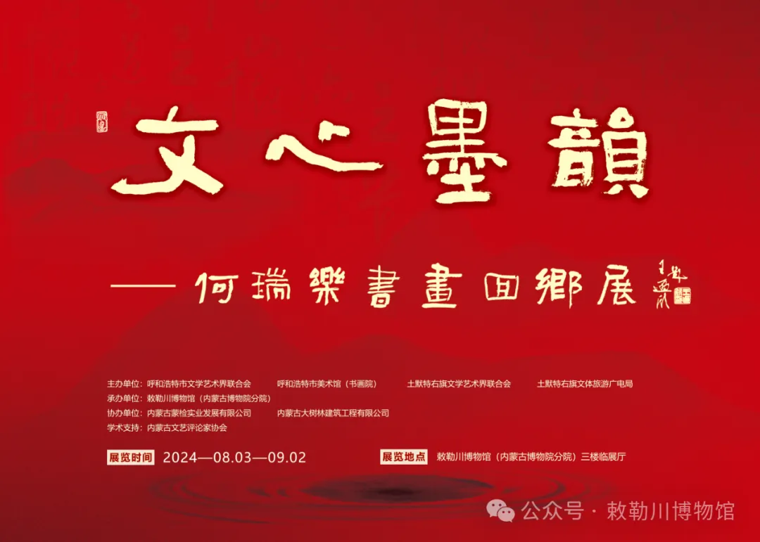 为深入学习贯彻党的二十届三中全会精神,弘扬传承中华优秀传统文化,落实打造“本土文化”品牌,在第七届内蒙古二人台艺术节暨沿黄省区地方戏展演活动即将开幕之际,由呼和浩特市文学艺术界联合会、呼和浩特市美术馆(书画院)、土默特右旗文学艺术界联合会、土默特右旗文体旅游广电局和敕勒川博物馆联合举办的“文心墨韵——何瑞乐书画回乡展"于8月3日在敕勒川博物馆临展厅开幕。