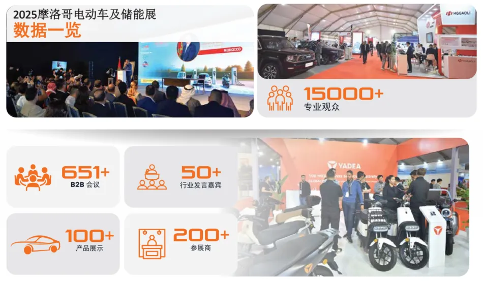 摩洛哥电动车与未来出行展(EVS Morocco)由中东国际展览集团(MIE)主办,致力于为全球新能源汽车产业链企业构建专业的展示、交流与合作平台,推动新能源汽车在非洲区域的可持续发展。该展会开创了中国企业以组团形式深度拓展中东及非洲市场的先例。首届展会于2025年11月在卡萨布兰卡成功举办,展览面积超15,000平方米,汇聚了120余家全球展商,全面覆盖新能源汽车、储能技术及充换电基础设施等领域。展会获得了摩洛哥工业与贸易部的特别支持,并吸引了包括中信戴卡、贝特瑞、雅迪等行业领先品牌参与,展现了摩洛哥电动出行产业的国际化活力与全产业链发展态势。