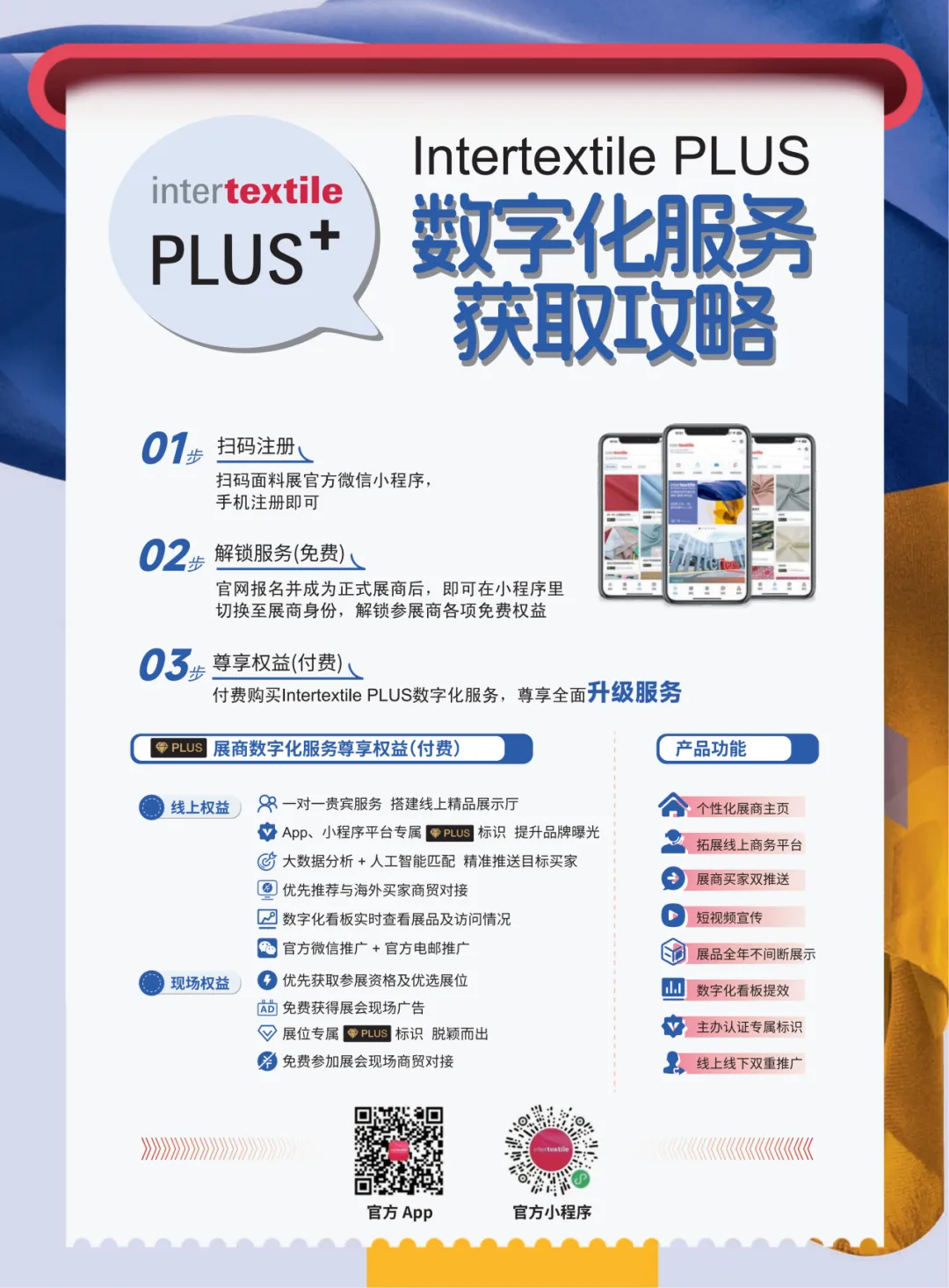2026Intertextile春夏面辅料展Intertextile PLUS+ 数字化服务尊享展商名单还将持续更新,欢迎展商踊跃报名,提前解锁更多权益,触达更多商机,开启商贸加速键!