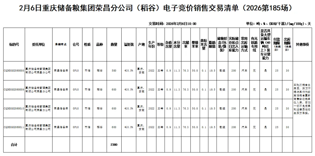 受重庆储备粮管理集团有限公司荣昌分公司委托,重庆市粮油批发市场有限责任公司(即国家粮食重庆交易中心,以下简称“批发市场公司”),定于2026年2月6日10:00举办重庆储备粮集团荣昌分公司(稻谷)电子竞价销售交易会,现将有关事项公告如下: