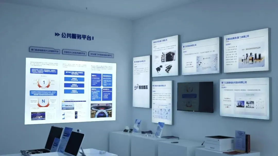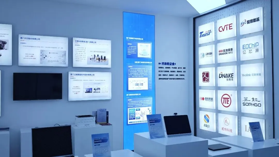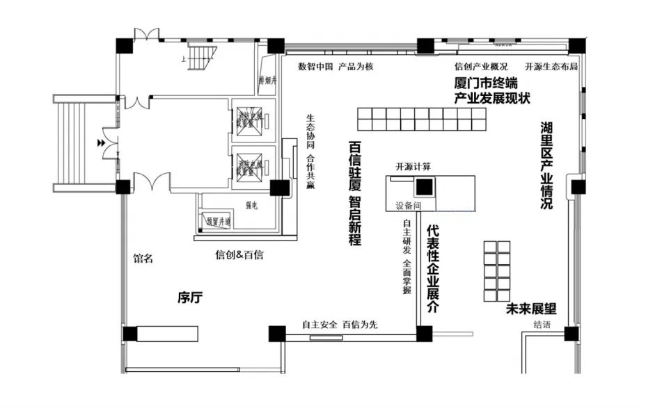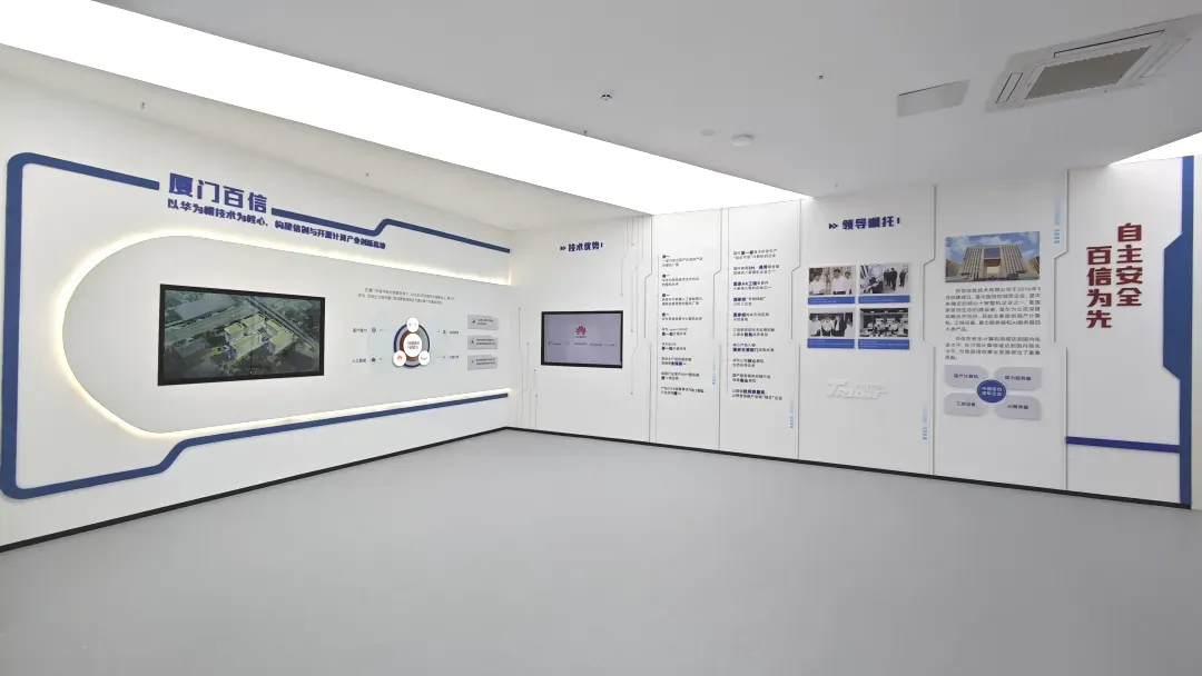 展厅共分为序厅、“百信驻厦 智启新程”、厦门市信创产业发展与开源生态布局”、“厚植根基 湖里蓄势再启程”层层递进。