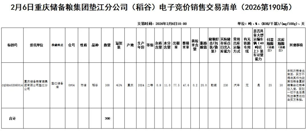 受重庆储备粮管理集团有限公司垫江分公司委托,重庆市粮油批发市场有限责任公司(即国家粮食重庆交易中心,以下简称“批发市场公司”),定于2026年2月6日10:00举办重庆储备粮集团垫江分公司(稻谷)电子竞价销售交易会,现将有关事项公告如下:
