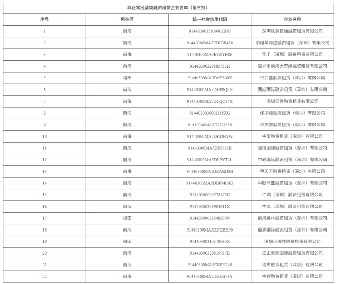 为深入贯彻落实中央金融工作会议精神,进一步强化融资租赁行业监督管理,切实防范化解金融风险,根据《关于进一步加强地方金融组织监管的通知》(金发〔2024〕8号)和《中国银保监会关于印发融资租赁公司监督管理暂行办法的通知》(银保监发〔2020〕22号)相关规定,深圳市地方金融管理局结合日常监管、分类评级、现场检查相关工作情况,经综合研判,认定我市第三批非正常经营类融资租赁公司名单,现向社会进行公告。