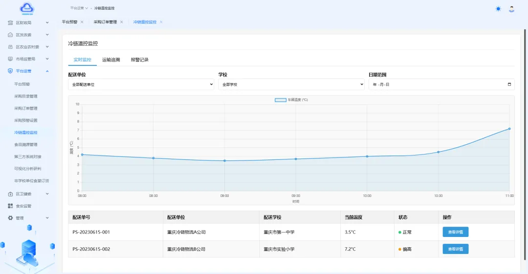 系统内置食安风险预警模型,实时监测采购资质、冷链温湿度等多类风险点,自动预警并推送含处置建议的信息;