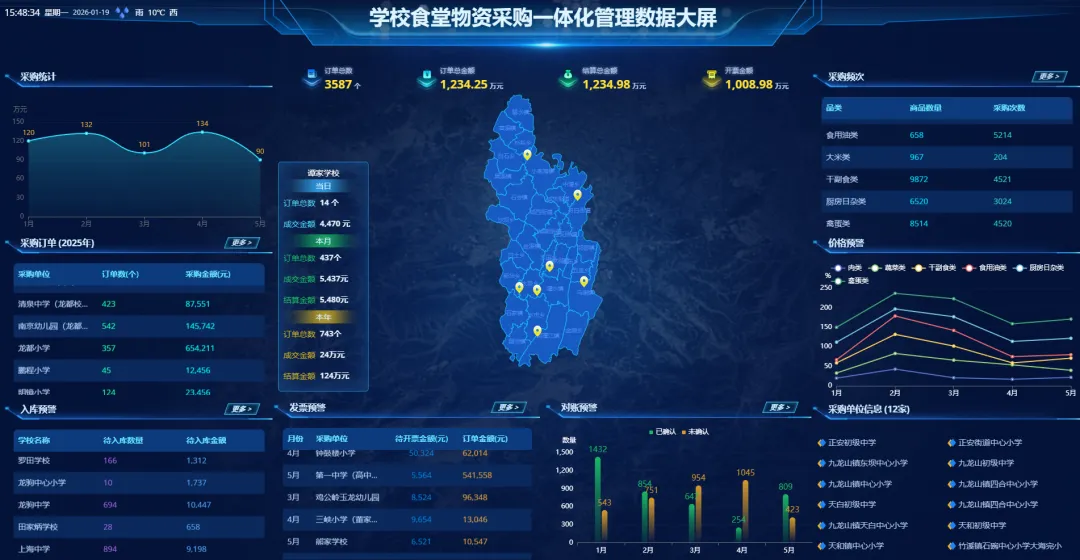 搭建区域食安监管可视化大屏,整合辖区学校、配送商全流程数据图表化呈现;