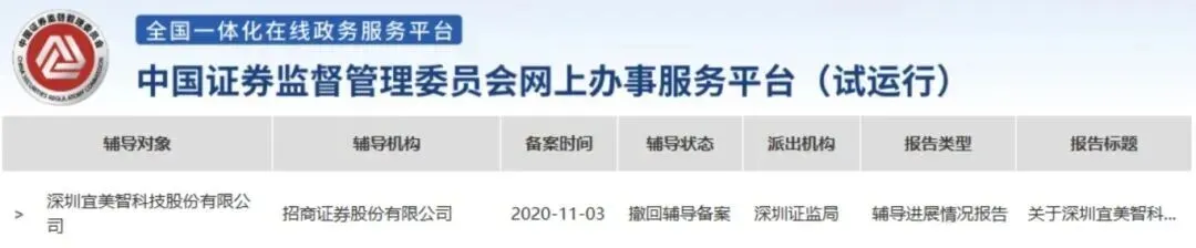 据悉,深圳宜美智科技股份有限公司于2020年10月27日与招商证券股份有限公司签署《辅导协议》,正式启动IPO辅导工作。此后,公司持续推进规范化建设,先后完成了21期辅导。