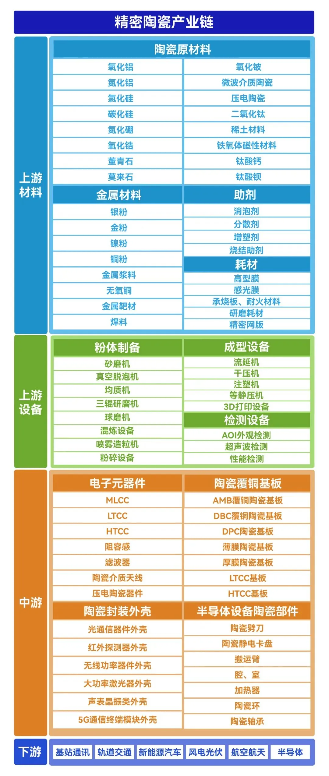精密陶瓷:氧化锆、氧化铝、氮化铝、氮化硅、碳化硅、氧化钇、结构陶瓷、高温陶瓷、透明陶瓷、陶瓷微珠、新能源陶瓷、陶瓷轴承、陶瓷球、半导体陶瓷(搬运臂、陶瓷劈刀、静电卡盘、蚀刻环……)、3D打印陶瓷、燃料电池(SOFC)隔膜片、穿戴陶瓷、光纤陶瓷插芯、陶瓷套筒、CIM、生物陶瓷等。