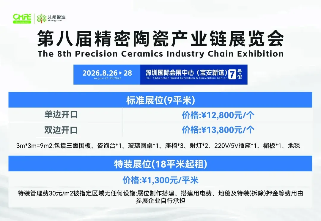 由艾邦智造独家主办的第八届精密陶瓷暨功率半导体产业链展览会将于2026年8月26-28日在深圳国际会展中心(宝安新馆7号馆)举行,汇聚精密陶瓷、电子陶瓷、IGBT/SiC功率半导体等产业链上下游企业,展示了行业最新技术成果和产品应用。