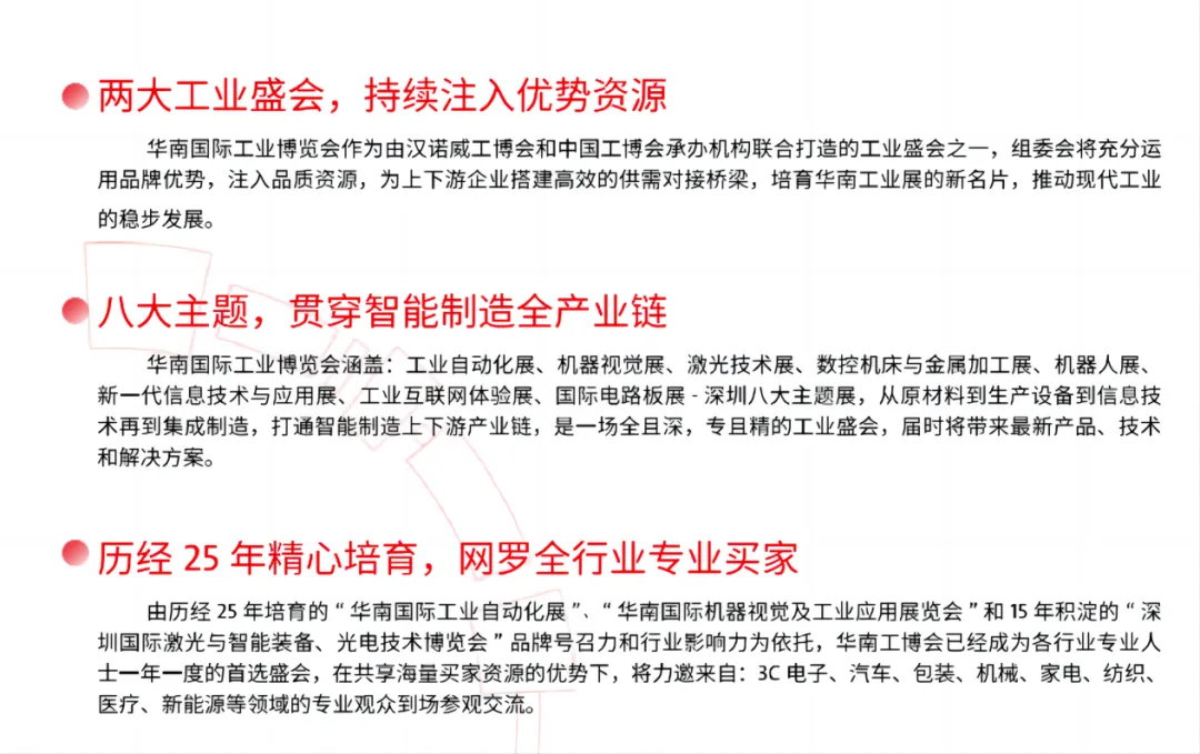 华南国际工业博览会立足未来工业的高站位,精确聚焦中国智能制造,将通过展示自动化、机器视觉和工业机器人技术、新一代信息技术和数字化工厂解决方案、金属加工和激光制造技术、节能与工业配套、新材料等全行业最新技术和解决方案,完美呈现智能工业产业链中的创新技术及产品的有效融合。