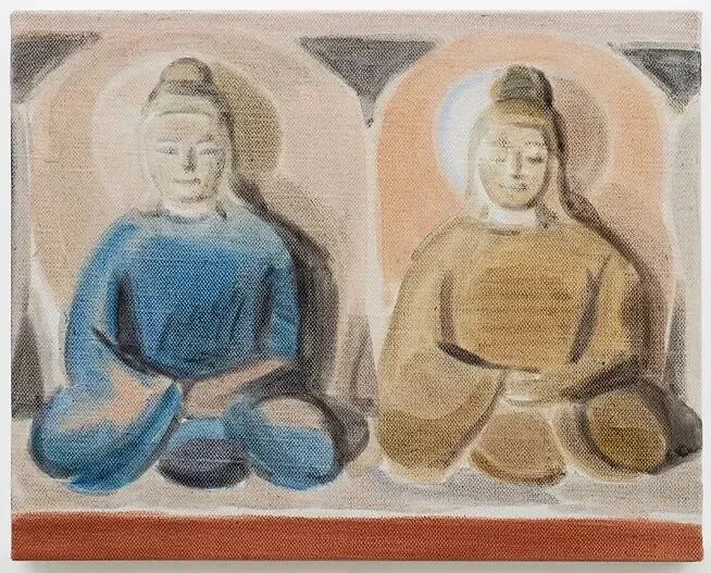 石至莹,《双佛的微笑》,2022,布面油画,40 × 50cm,图片来源于德玉堂画廊